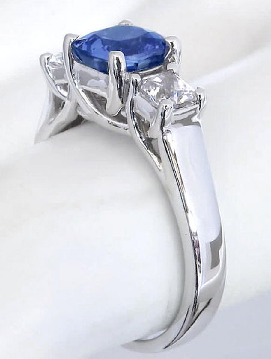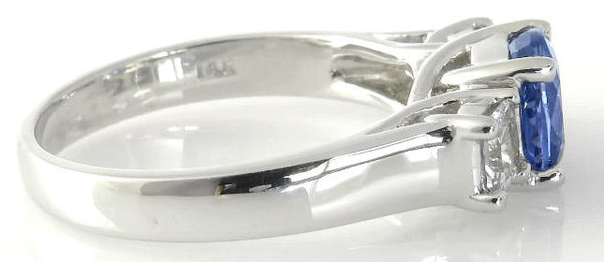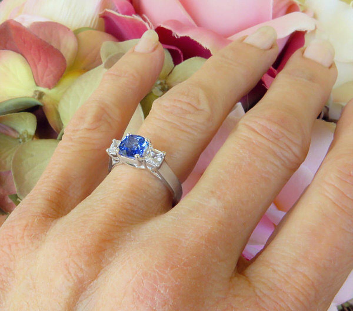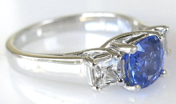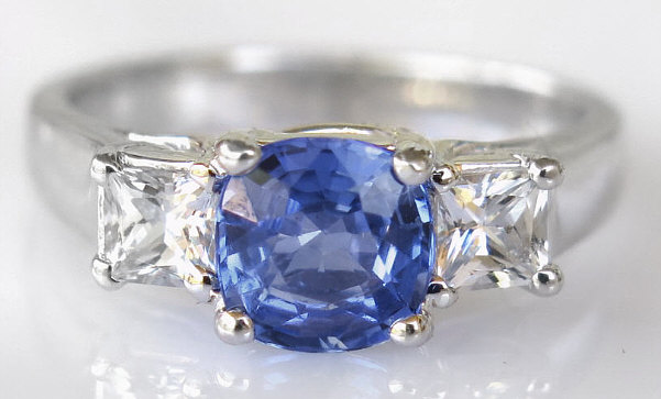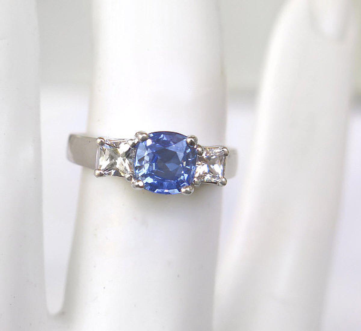Special Features: This elegant engagement ring has classic and symbolic past present future styling with a beautiful cornflower blue sapphire flanked by two white sapphires. We love the one of a kind color of this unique sapphire and for those looking for a diamond alternative engagement ring, this ring is a truly special choice. Sapphires are the hardest gemstone and are an ideal choice for a ring that will be worn frequently. The cushion cut sapphire  weighs 1.37 carats and has a light-medium slightly periwinkle, cornflower blue color. Oh, it's so pretty! The sides are 3.6mm princess cut white sapphires. They look very much like diamonds but are much more affordable. The gram weight of the setting is 4.1 grams and this weight will not only be comfortable but hold up nicely to a lifetime of wear.