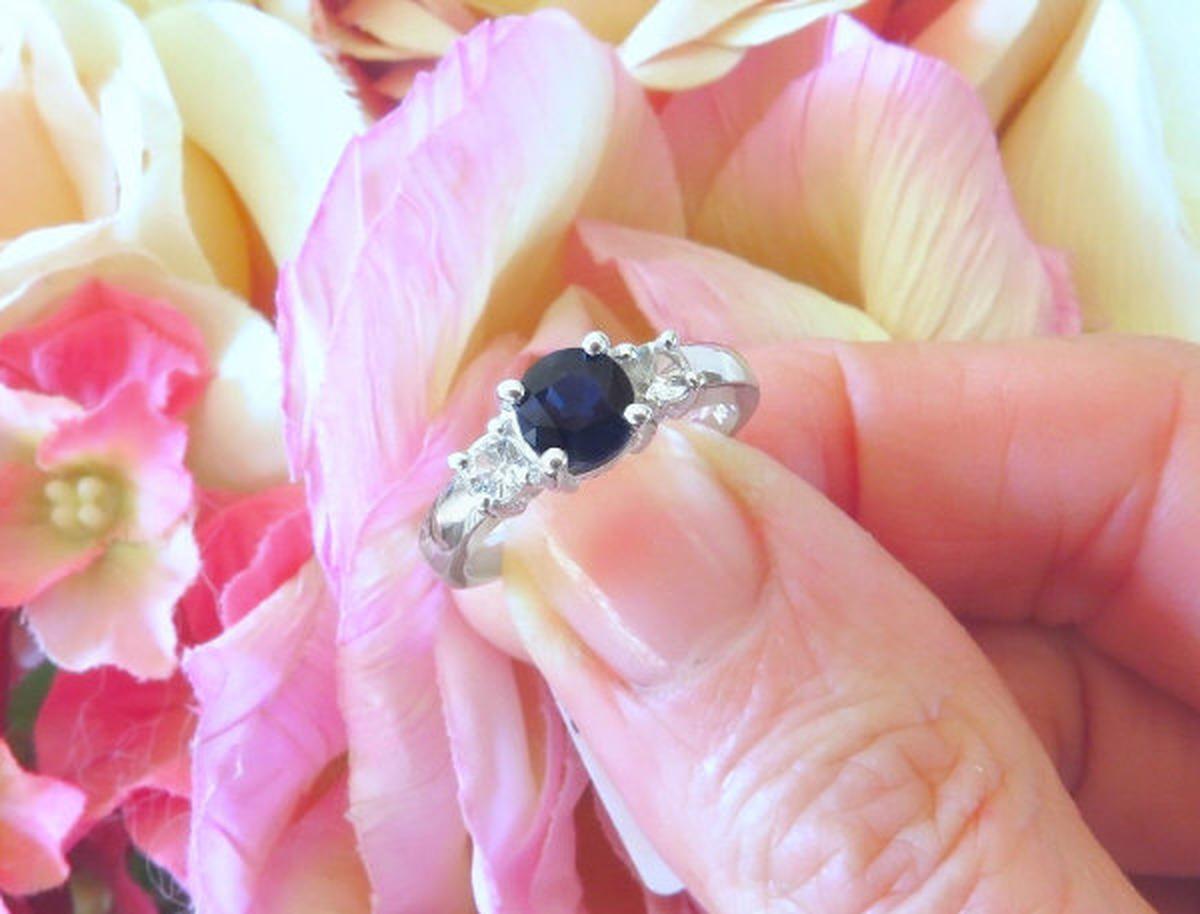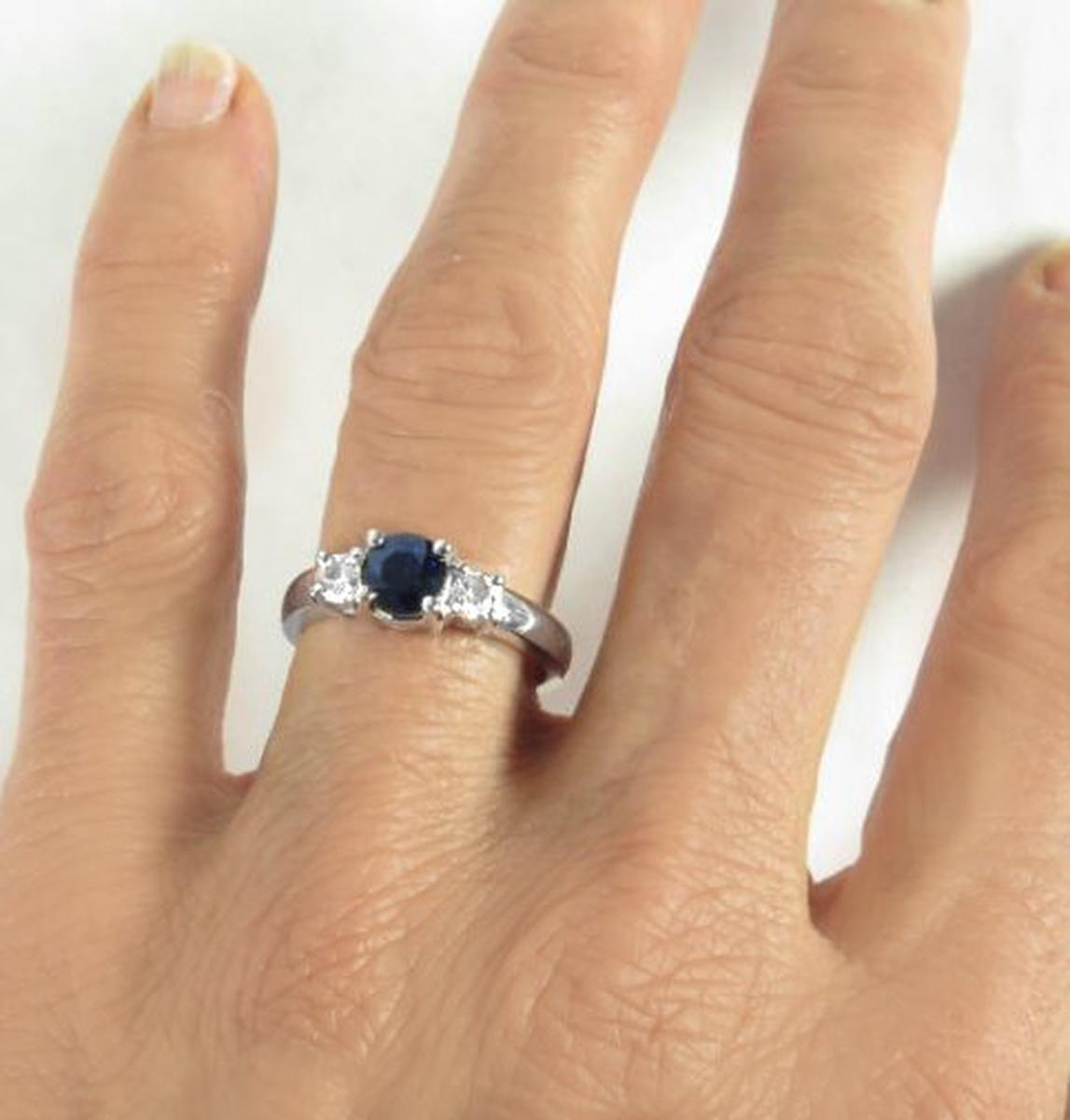 Classic Natural Round Dark Blue Sapphire and White Sapphire Three Stone Sapphire Engagement Ring in 14k white gold for sale   Sapphire Ring with White Sapphires in 14k white gold