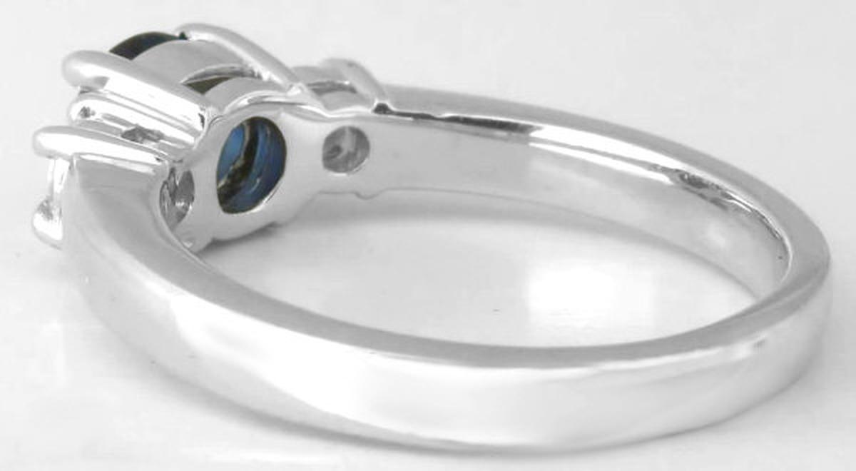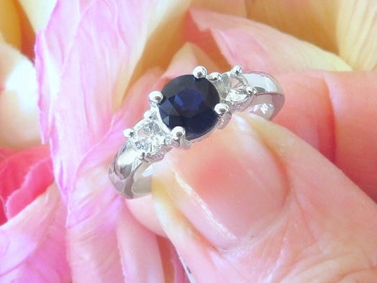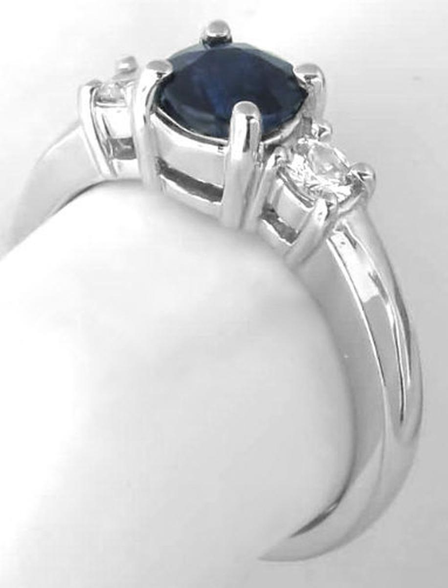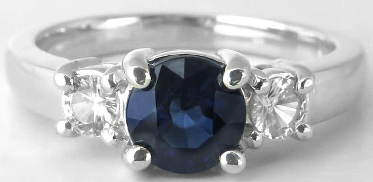 Special Features: Simple, elegant and everlasting, this pretty three stone ring features round blue and white sapphires in a classic symbolic design. The sapphire weighs just over 1 carat and is 5.7mm across. It has a rich and deep blue color and is better than eye clean. The 3mm white sapphires on either side are a great option for a diamond substitute. They are also clean and nicely cut. The setting is done is 4.3 grams of solid 14k white gold. The gram weight is substantial enough to ensure that the ring will stand up to a lifetime of wear.