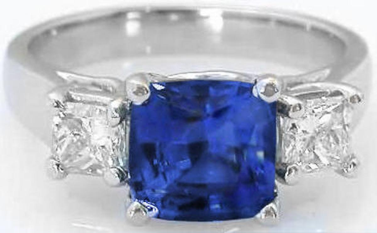shape. This truly is a rare stone! The sapphire is flanked by two large princess cut diamonds for a very elegant three-stone look. The diamonds are of equally