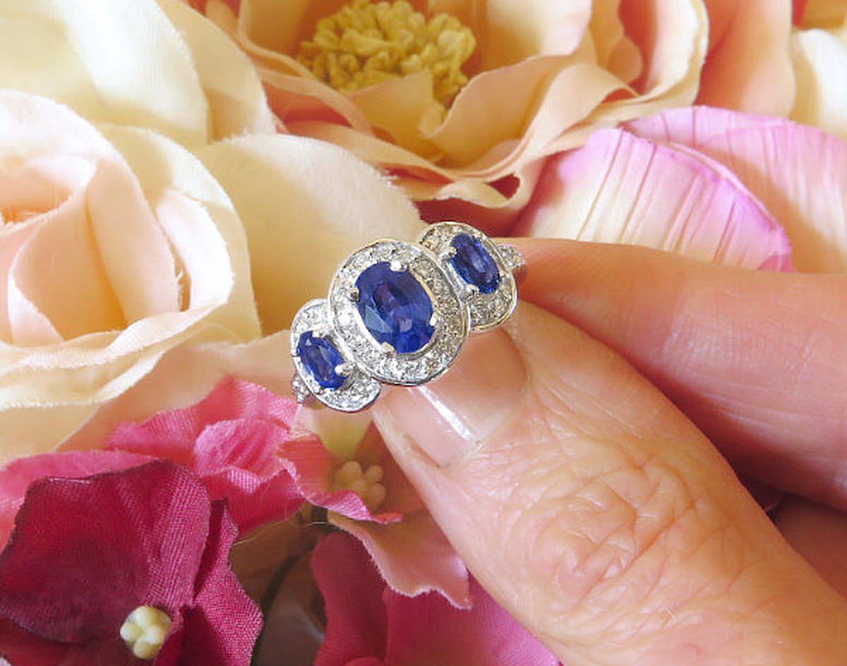 blue Ceylon sapphires to the surrounding diamond halos, the design is