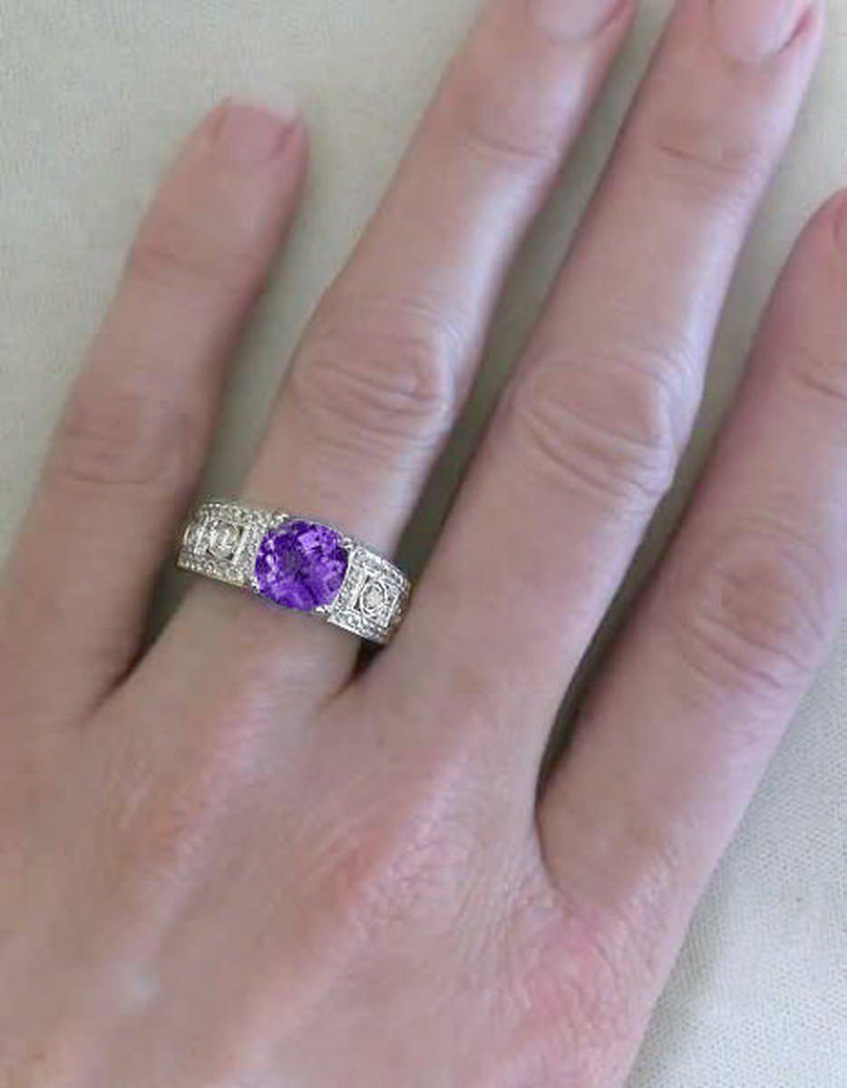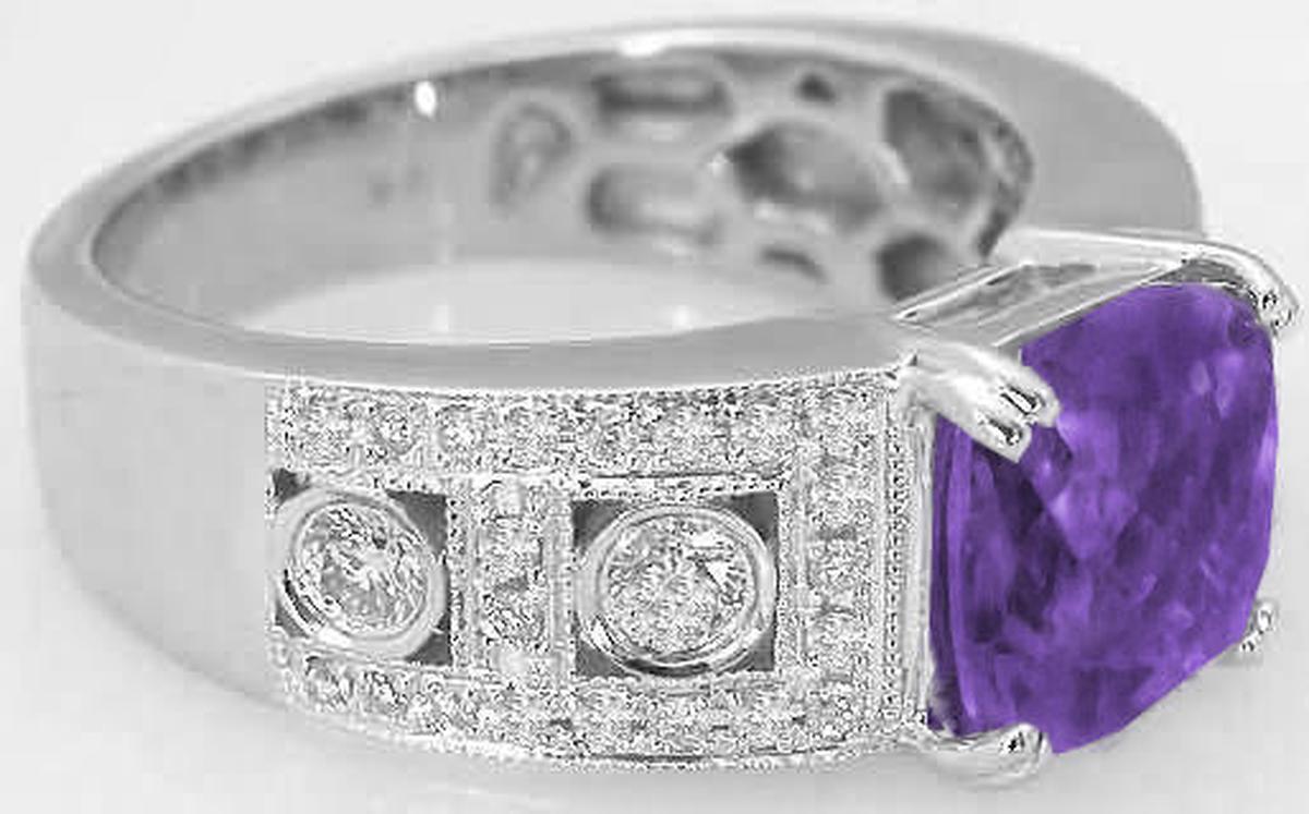 Special Features: If you are looking for a comfortable, wearable, low profile ring with a lot of impact, we invite you to consider this unique wide band amethyst ring. Featuring a gorgeous high quality 8mm cushion cut amethyst with checkerboard faceting, this ring is a great choice for February babies or those who just love the color purple. This amethyst has a rich tone, but not too dark. It is just beautiful. The wide band mounting is adorned with bead set and bezel set round diamonds. The milgrain (beaded) edging lends a bit of a vintage feel to the design.  The gram weight is substantial and you can feel the quality when it is on your finger. But don't worry, it's not overly heavy. This is one very comfortable and wearable ring. We've even added a beautiful undergallery which only adds to the comfort level. The gram weight, undergallery and low profile make this an ideal choice for every day wear.