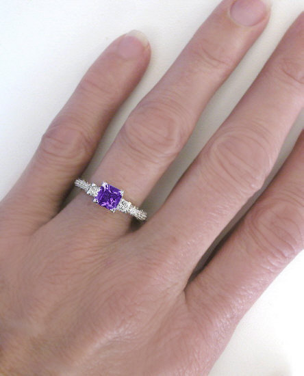 Special Features: If you're looking for an elegant vintage inspired ring with a gorgeous amethyst center stone, this ring may just be the perfect choice. The amethyst at the center is the same size (in millimeters) as a 1 carat princess cut diamond, so this is the ideal size for a ring that will be worn often. The color is a wonderful slightly pinkish purple of medium tone. It is not light nor too dark and the pink flashes are often found in higher quality amethysts. On either side of the amethyst is a fine quality princess cut diamond of approximately 0.15 carats in size. The diamonds are better than eye clean and near colorless too. The shank is done with tiny bead set diamonds and milgrain edging. Even the sides of the ring are finished with antique details with the marquise filigree pattern.