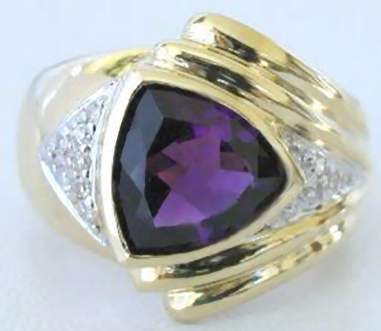 Special Features: Vibrant trillion cut amethyst set in a beautifully designed wide band gold ring with diamond accent stones. The bezel setting frames the amethyst and also offers protection during daily wear. with 7 grams of 14k gold, you are going to love the way this feels on your finger.