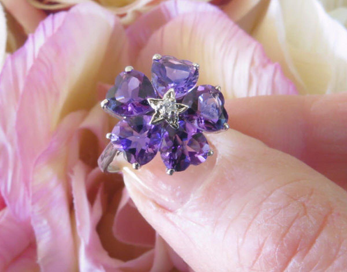 Gemstone: Natural Amethyst A beautiful amethyst ring with heart-shaped gemstones in a flower design.