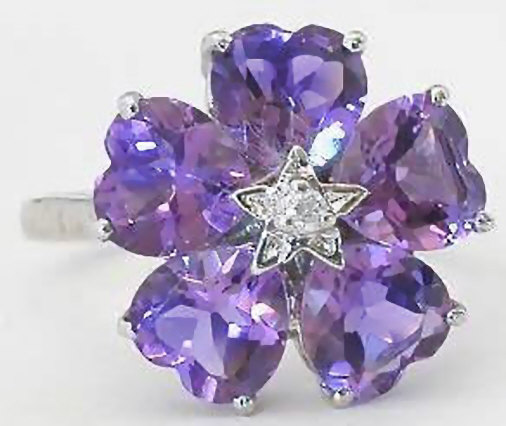 Special Features: This lovely ring features five beautifully matched 6mm heart shaped amethyst gemstones set into a flower design. The center of the flower is accente by a tiny diamond. The gallery is open to allow the light to pass through the stones, making them bright and vibrant.