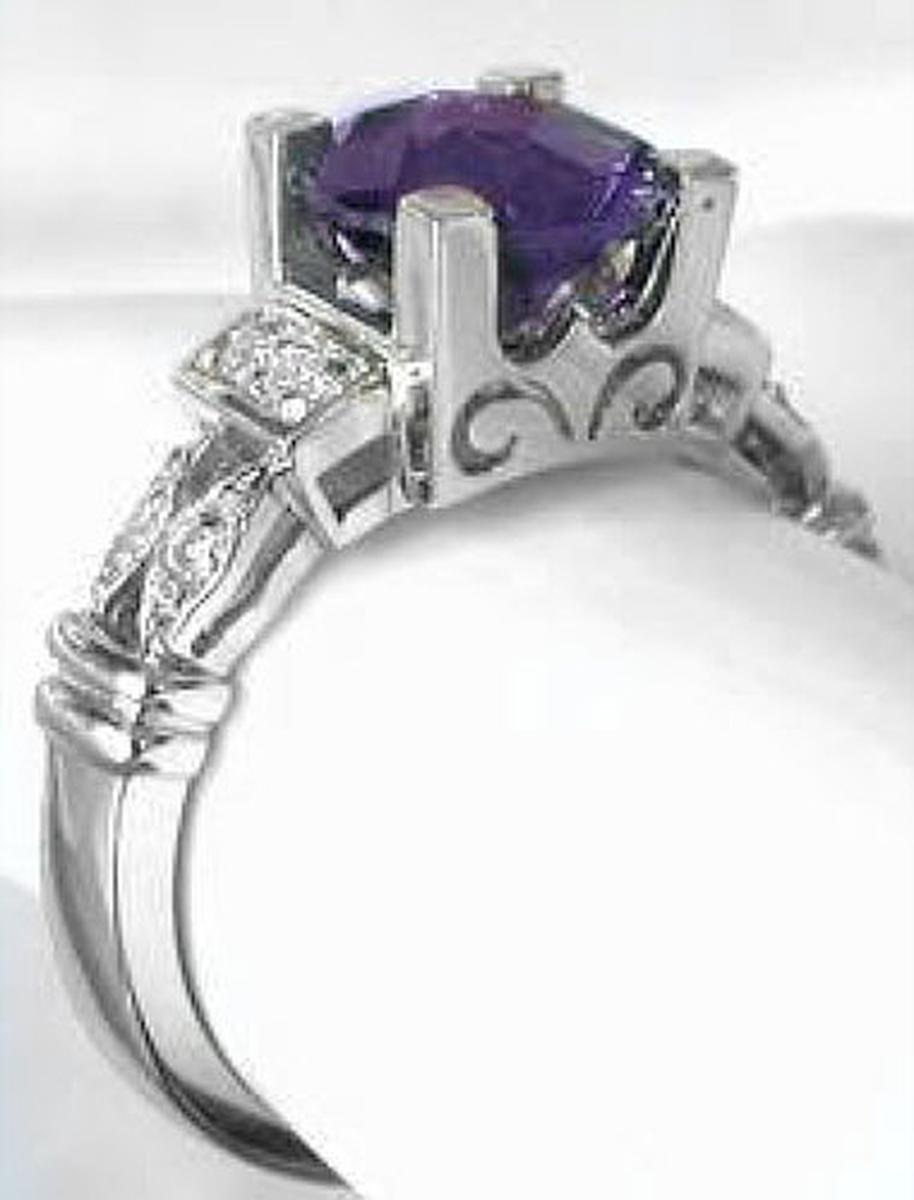 Special Features: The sparkling checkerboard cut amethyst has fabulous flashes of pink and purple. We just love this mounting. It is simple and elegant yet has a lot of design detail. The round center stone in set into a square basket with filigree detail and is held securely by four prongs. On either side, two small rounds diamonds are followed by two more rounds set in marquise shaped stations. A small ribbed accent completes the look.