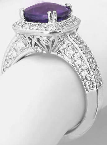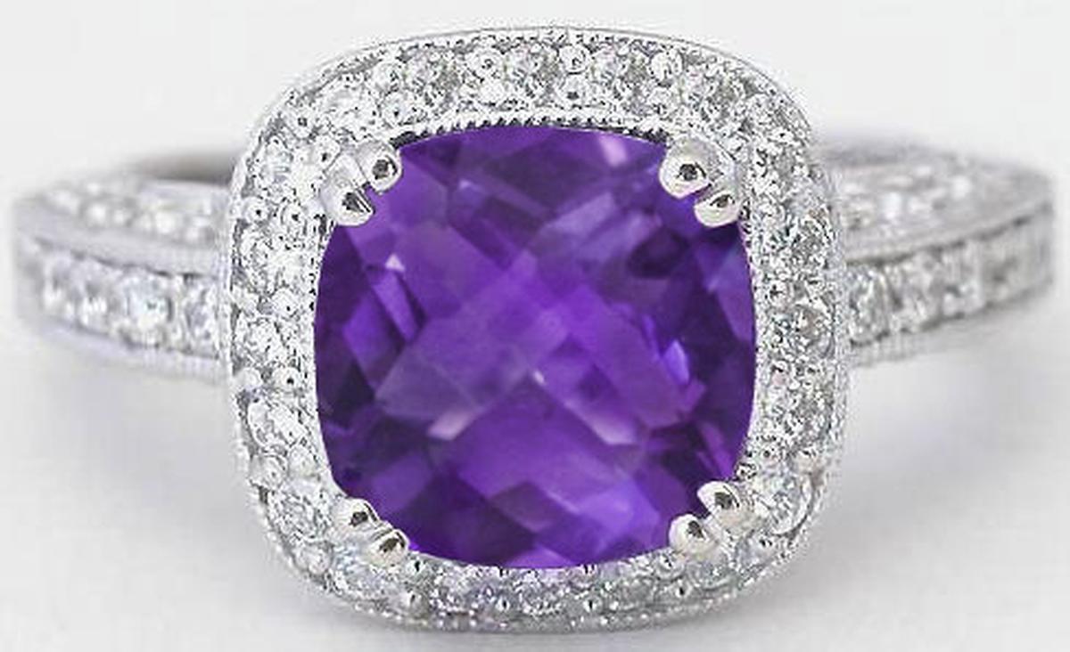 Cushion Cut Amethyst Diamond Halo Rings in 14k white gold   Ornate Cushion Cut Amethyst and Diamond Rings in 14k white gold