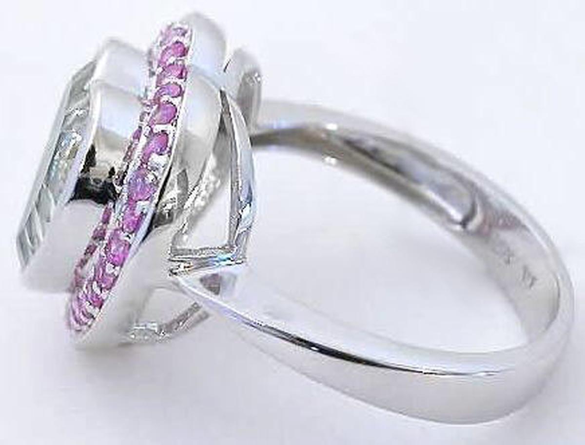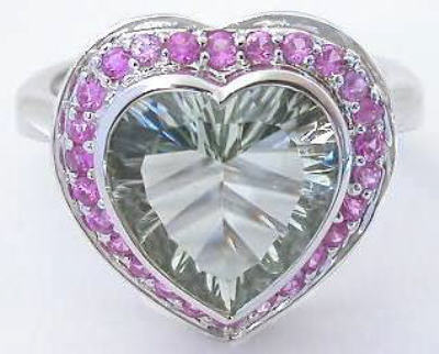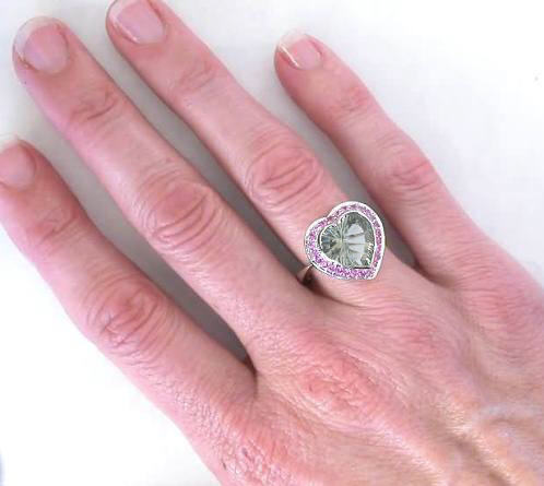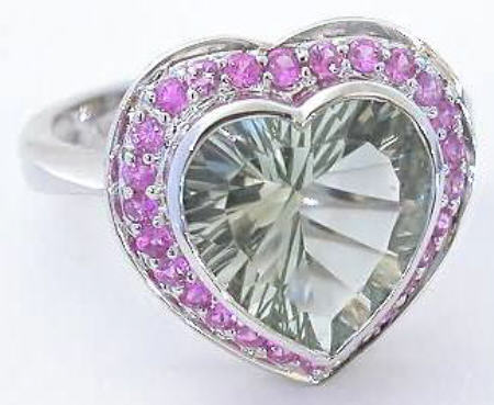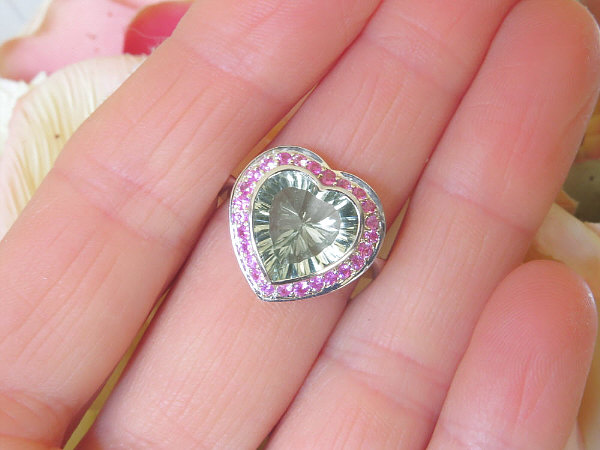 Special Features: This fun and flirty design features a gorgeous 11m heart shaped Prasiolite with a beautiful light minty green color. The Prasiolite is well cut and bezel set for protection. The bezel also accentuates the heart shape. Surrounding the Prasiolite are bead set bright natural pink sapphires. The color combination is both elegant and eye catching. The band is narrow at the center and widens towards the back for a well-balanced fit. This ring is very comfortable on the finger and since there are no prongs, the ring is also one that would be easy to wear on a daily basis.