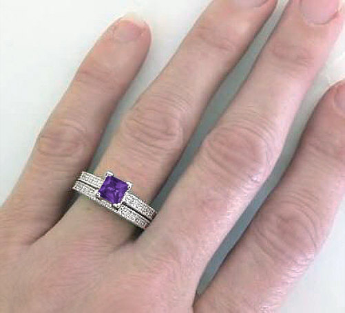 Princess Cut Antique Style Amethyst Engagement Ring and Wedding Band   Antique Style Amethyst Rings in 14k in 14k white gold