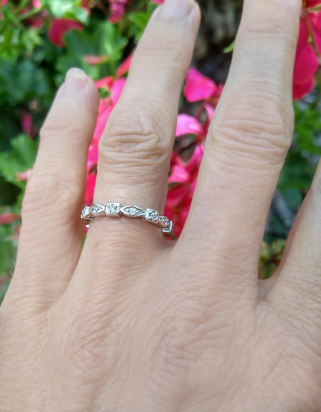 Petite stackable 3/4 eternity style diamond band with marquise and square cut stations in 14k white gold for sale