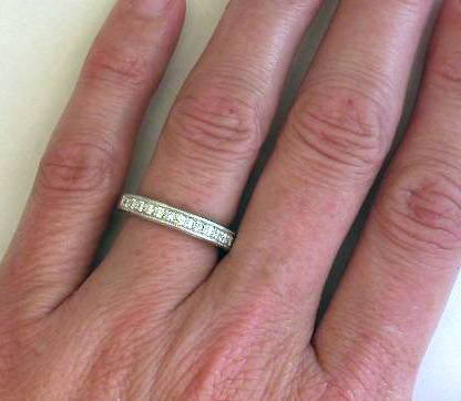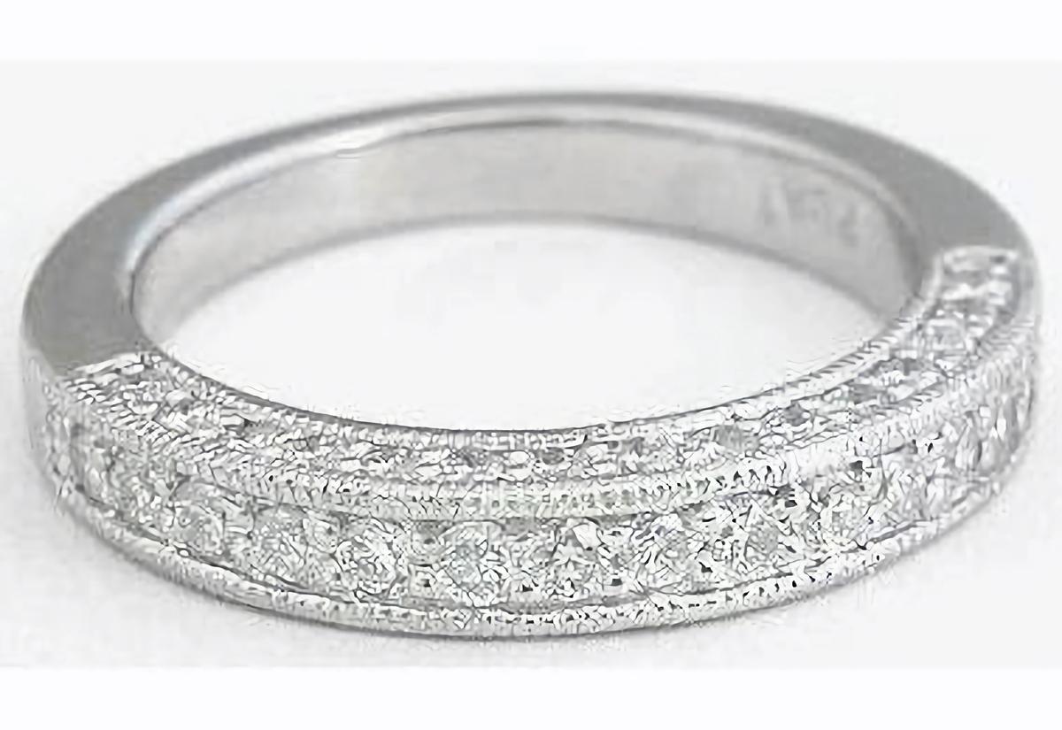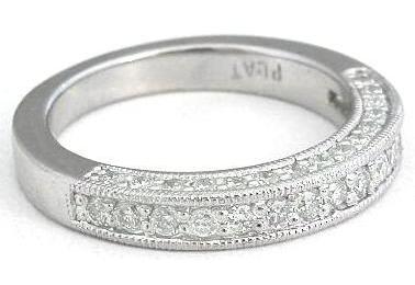Special Features:Luxurious platinum and fine diamonds, this diamond band is a classic that will stand up beautifully to a lifetime of wear. This elegant band features forty-five gorgeous fully cut round diamonds expertly bead set in this versatile platinum band. The diamonds are of very fine quality, near colorless and better than eye clean, set on three sides of the ring.  Milgrain edging accentuates the sides of the ring and lends a vintage feel to the piece. This ring is the perfect complement to an engagement ring or buy two for stacking on either side of your favorite ring.