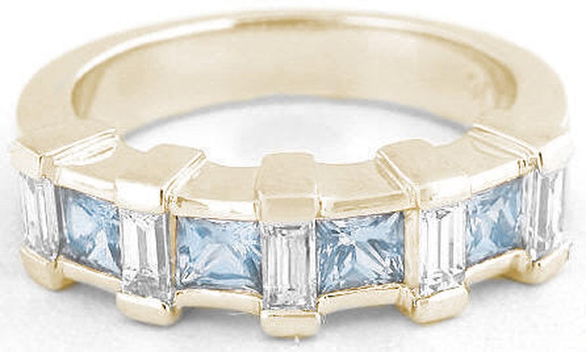 Special Features:Only at MJS! This elegant band style ring has a fresh new look with princess cut aquamarine gemstones combined with classic baguette diamonds. Aquamarine, the birthstone for March, has a soft and pretty sky blue color and the princess cutting of the stones allows for maximum brilliance and sparkle. Streamlined baguette diamonds are set in between for a graceful look. The diamonds are near colorless and better than eye clean and add an element of refinement to the ring. The 14k yellow gold setting is substantial and has a certain weight to it that feels wonderful on the finger, and the ring will easily stand up to a lifetime of daily wear. We think that this ring would make a great anniversary band, wedding band or promise ring. It is wonderful as a stand alone ring or may work very nicely with another ring you already have.