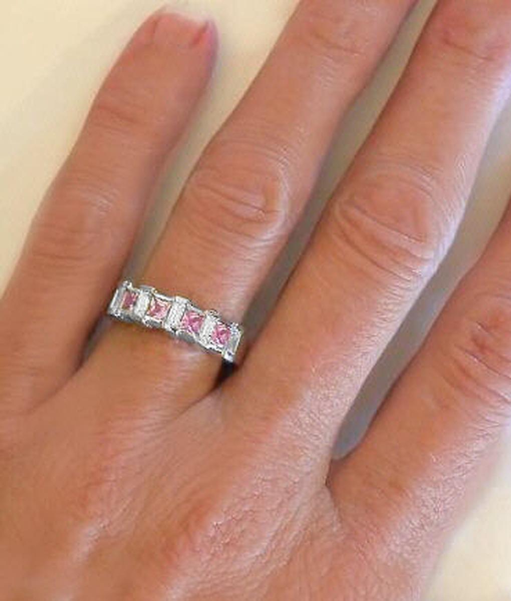 Pink Sapphire Anniversary Band Rings in 14k white gold   Princess Cut Pink Sapphire and Baguette Diamond Wedding Bands