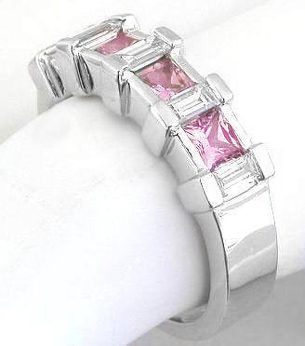 Special Features: This ring is exceptional in every way and will please the most discriminating taste. The princess cut pink sapphires are a light baby pink color. The baguette diamonds are VS2-SI1 in clarity which means that they are among the finest diamonds used in gemstone jewelry. The band is made of 14k white gold or platinum and has a substantial weight that feels wonderful on the finger. When all of this comes together, you get a striking piece that will be sure to capture attention and be one of your very favorites.