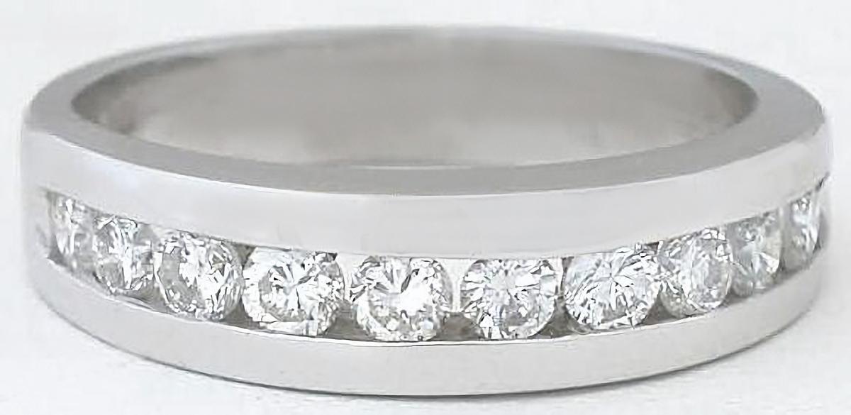 Special Features:This is a classic wedding band featuring 10 brilliant cut round diamonds in a high quality durable 14k white gold  channel setting. The ring measures 6mm wide at the front and tapers slightly to 4mm at the back. We have used fine quality, fully faceted round diamonds which are near colorless (G-H color) and better than eye clean (SI clarity). The diamonds are dazzling and full of sparkle and the quality will be readily evident when you see this ring in person.