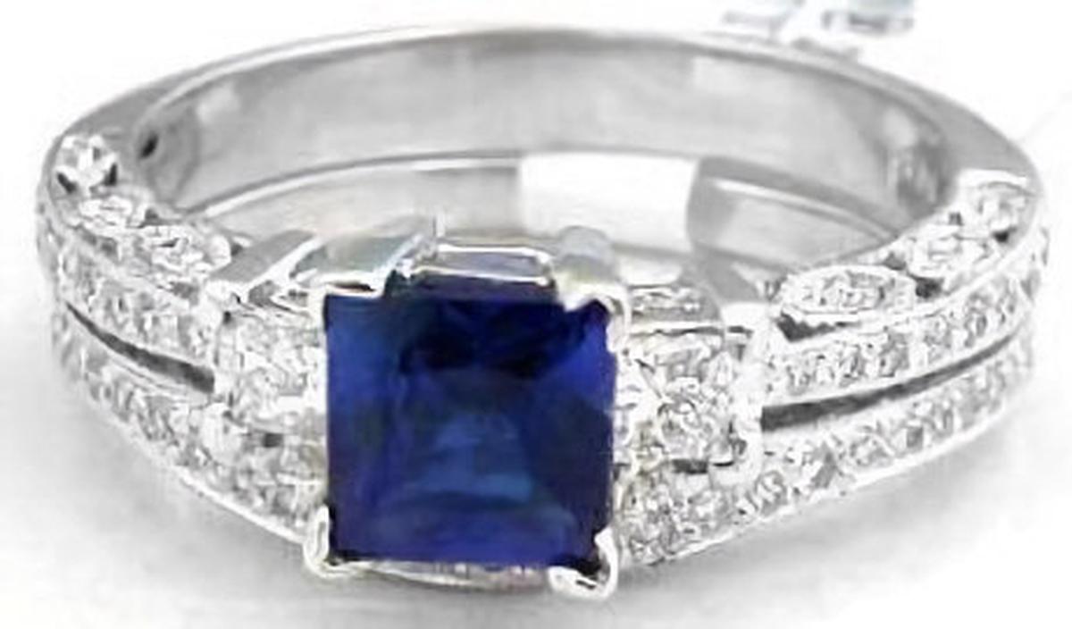 world flavor, and the gorgeous sapphire is flanked by two large princess cut diamonds. Milgrain edging and