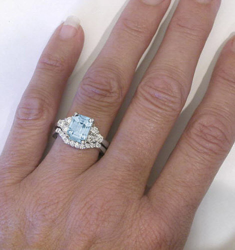 Emerald Cut Aquamarine Engagement Ring and Matching Band in 14k white gold   Aquamarine Diamond Engagement Ring in 14k white gold