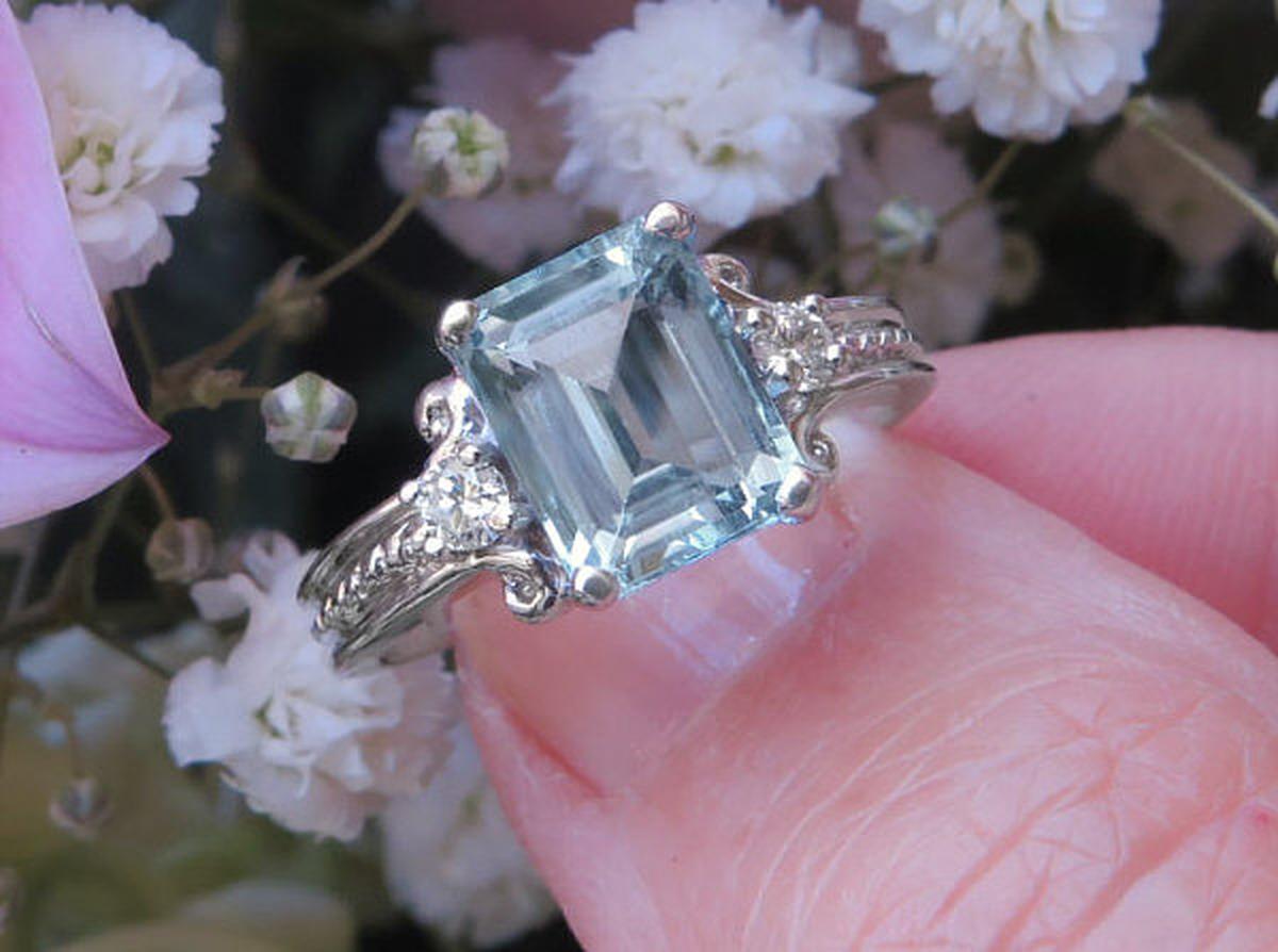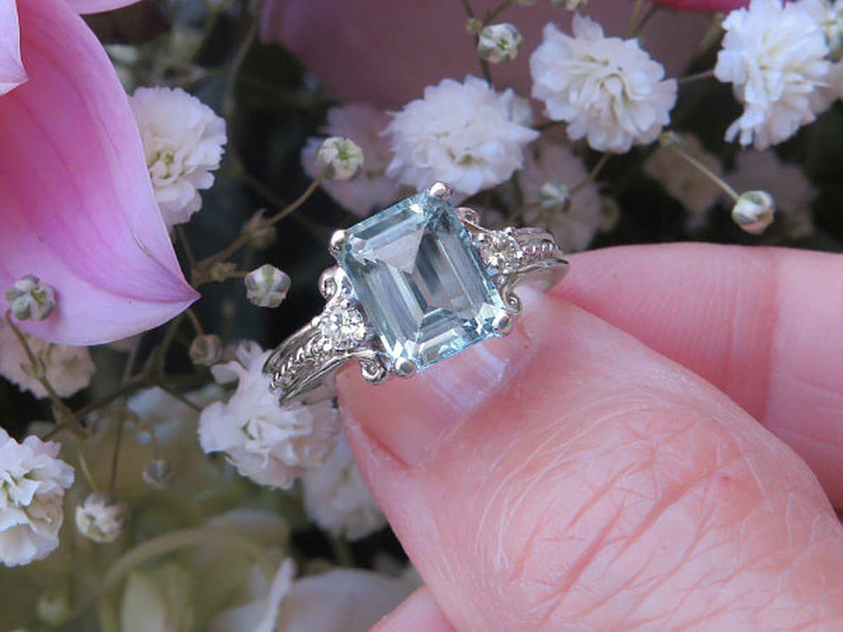 Emerald Cut Aquamarine Engagement Ring in 14k white gold   Emerald Cut Aquamarine and Diamond Engagement Ring in 14k white gold