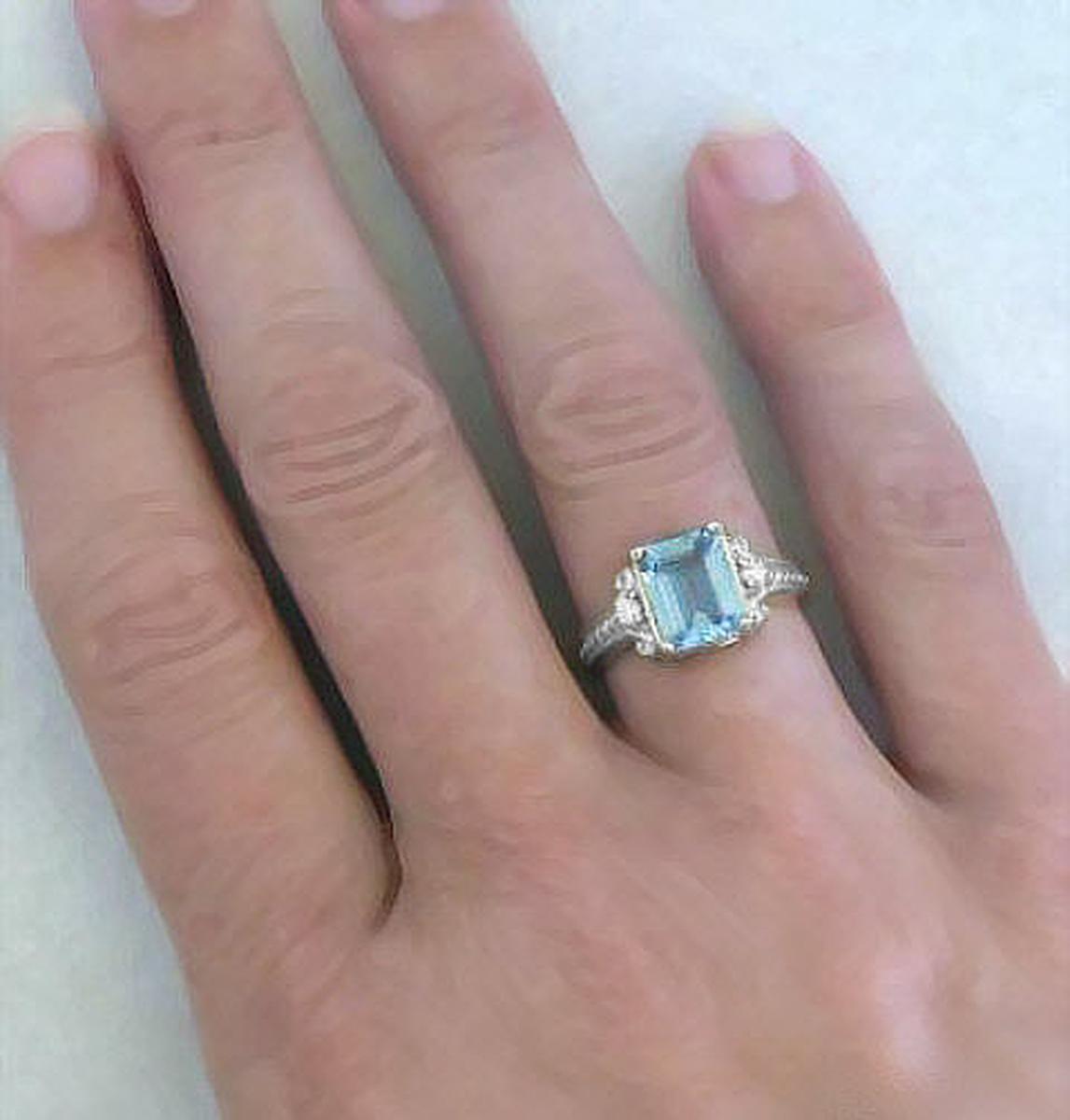 Special Features: The beautiful light blue color of this large 7x9mm aquamarine is the focal point of this elegant ring. A delicate scroll and rope design detail adorn the shank and a full cut round diamond accents each side of the aquamarine.  The ring has a relatively flat profile making this a piece that will be easy to wear often.