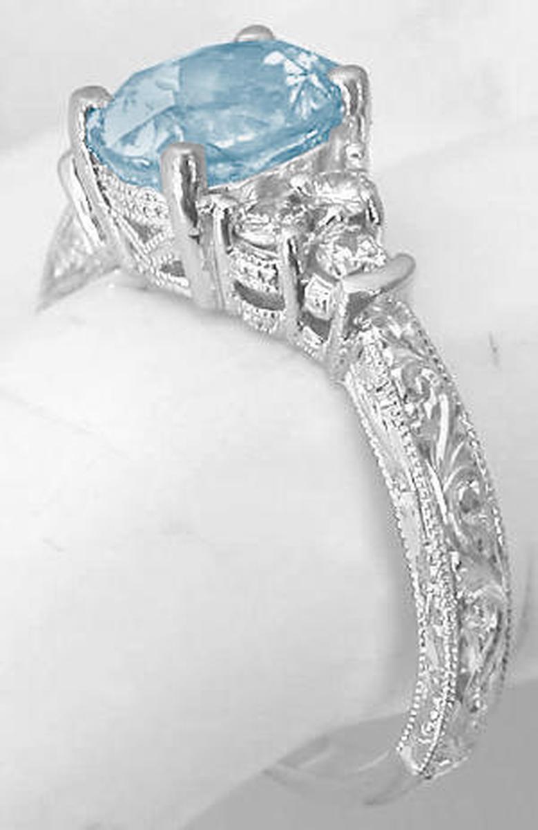Vintage Aquamarine Ring with Engraving in 14k white gold   Antique Aquamarine Diamond Ring with Engraving in 14k white gold