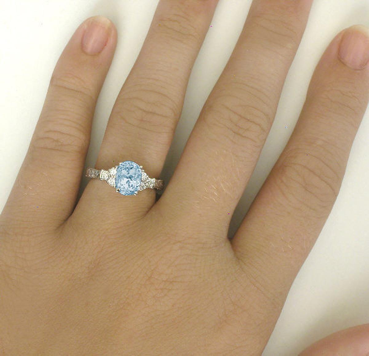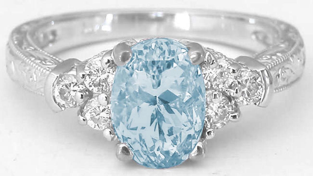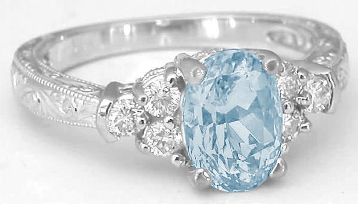 Special Features: A MJS Original Design: We just adore this new ring. We've taken a very simple design and turned it into vintage delight with the beautiful medium color (rich sky blue) aquamarine and eye clean, white diamonds and elegant engraving on the band. There are three diamonds on each side and they add the perfect touch of tasteful sparkle to the ring.  And last but definitely not least is the amazing engraving we have added to the ring. On three sides, there is beautiful scroll detail with beveled edges so even the engraving even has a certain amount of sparkle. Note that the basket areas holding the aquamarine and diamonds are finished with milgrain edging to complete the look.