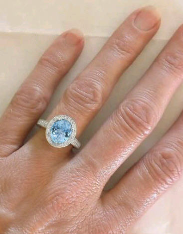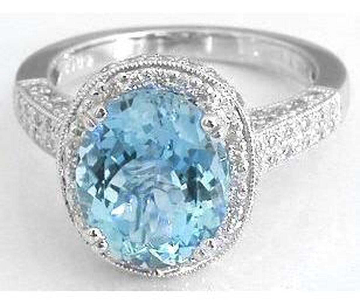 Special Features:Elegant and feminine, this ring features a gorgeous 8x10mm oval aquamarine that is truly stunning because of its large size and tremendous amount of sparkle. The mounting is covered in pave diamonds! Three sides of the shank, the gallery (the basket setting) and surrounding the aquamarine, beautiful diamonds are set with a milgrain border which adds a vintage feel to the ring. This ring is so tastefully and perfectly done. It is an ideal choice for a birthstone (March) ring, and we also think that it would be an absolutely amazing engagement ring. We are certain that once you have it on, you will find yourself smiling as you catch glimpses of it on your finger.