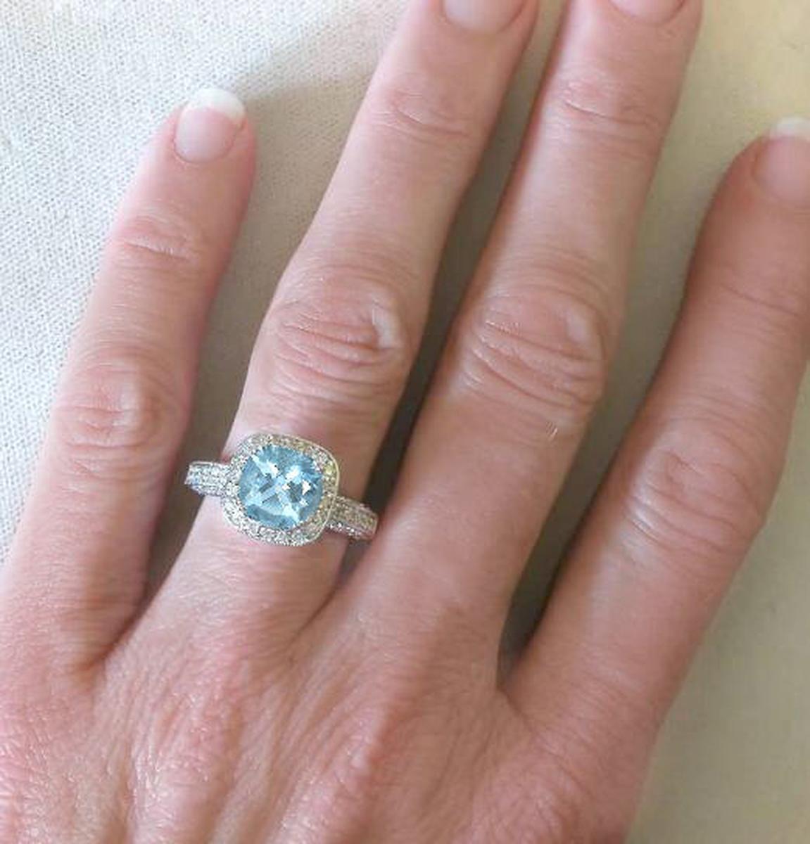 Special Features: A MJS Original Design: This oh-so elegant ring features a gorgeous 8mm round aquamarine of very fine quality. It is better than eye clean and has a gorgeous light icy sky blue color. This aquamarine is not too pale and it is lighter than some of darker rich colored aquamarines we offer. This has more of a traditional color.  The ring itself has so many wonderful design elements. From the bright white, fine diamonds that surround the center stone to the fancy gallery with the scroll detail, to the milgrain edging to the finished undergallery, we have left nothing undone or incomplete. All of the fine details lend a vintage feel to the piece yet the ring has a nice gram weight to it, so it also feels wonderful and substantial on the finger.