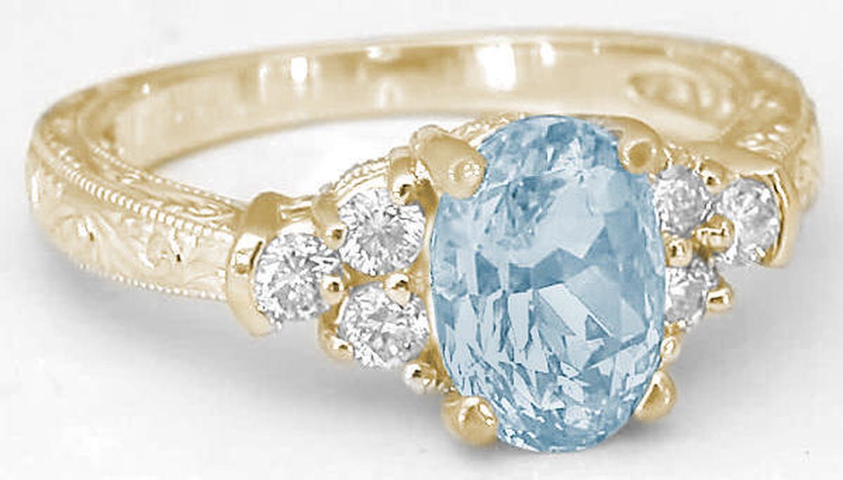 Special Features: A MJS Original Design: We just adore this new ring. We've taken a very simple design and turned it into vintage delight with the beautiful medium color (rich sky blue) aquamarine and eye clean, white diamonds and elegant engraving on the band. There are three diamonds on each side and they add the perfect touch of tasteful sparkle to the ring.  And last but definitely not least is the amazing engraving we have added to the ring. On three sides, there is beautiful scroll detail with beveled edges so even the engraving even has a certain amount of sparkle. Note that the basket areas holding the aquamarine and diamonds are finished with milgrain edging to complete the look.