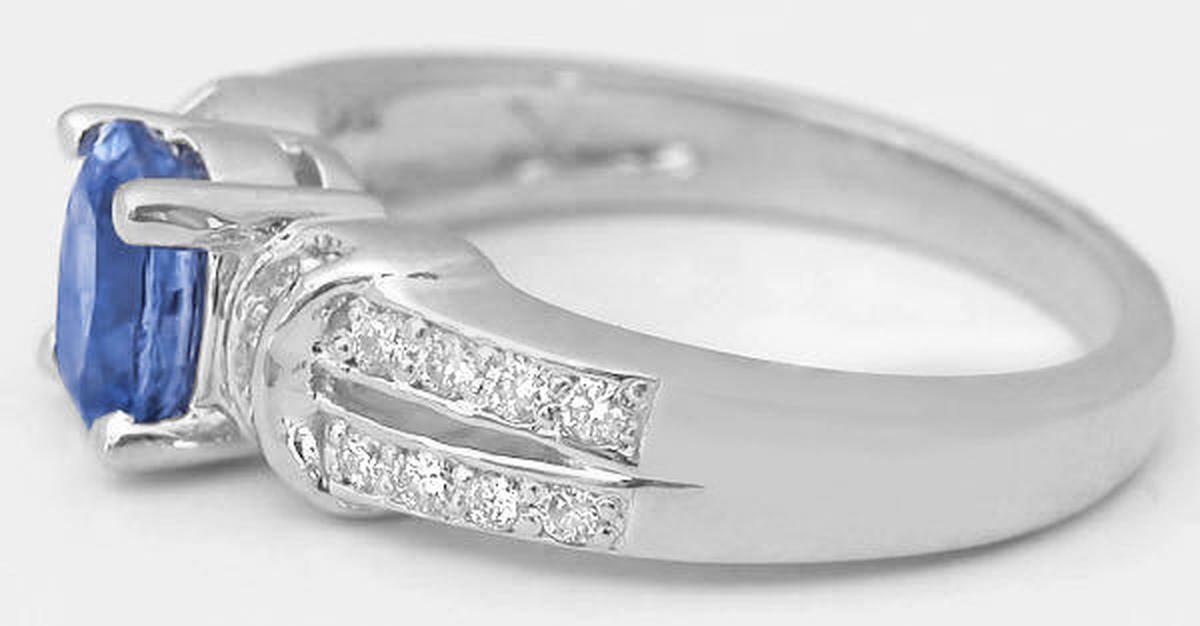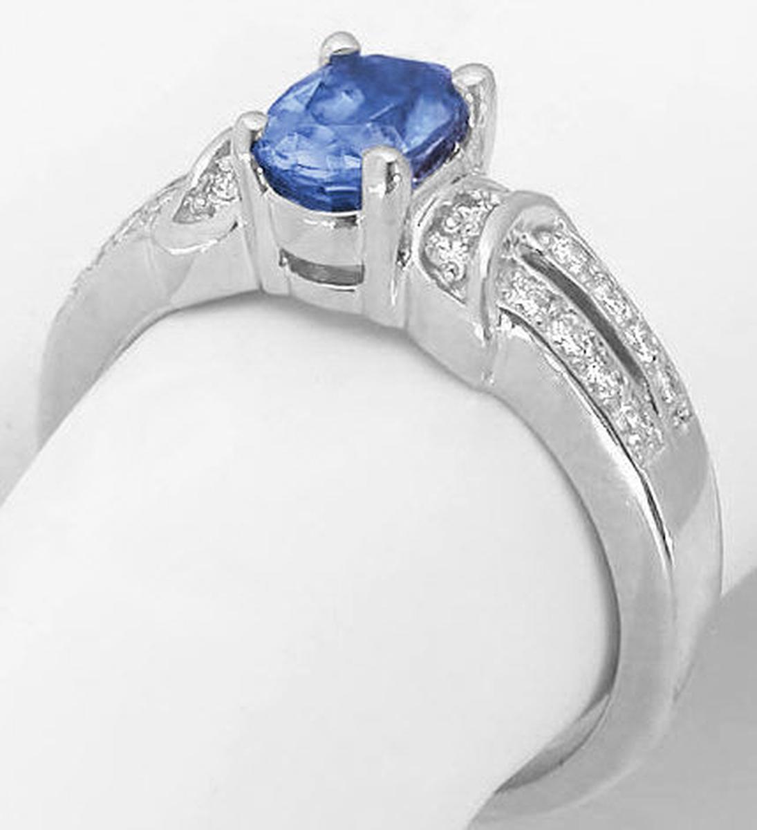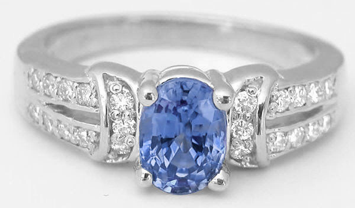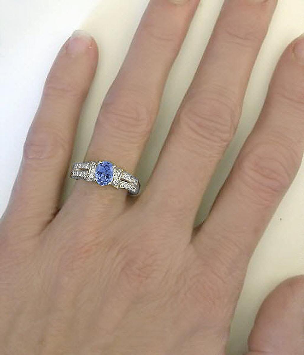 Special Features:This wonderful oval sapphire and diamond ring features a pretty Ceylon sapphire in a beautiful medium periwinkle blue color. It has a nice cut and is much better than eye clean. It is gently adorned with 1/4 carat of fine white diamonds for a perfect everyday look. We love how versatile and wearable this ring is. The low profile (at 3/16") and the hardness of the sapphire assure that this ring will hold up nicely for many many years.