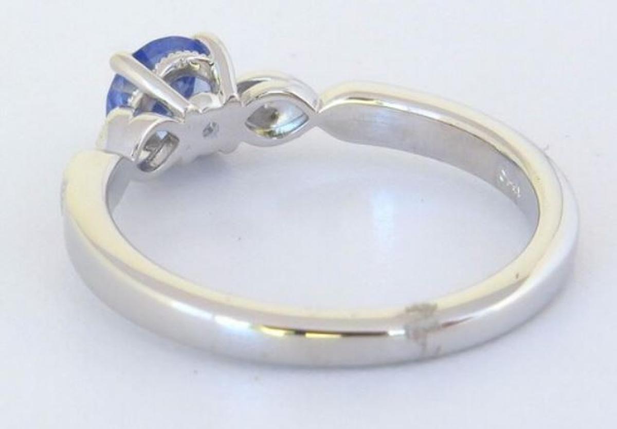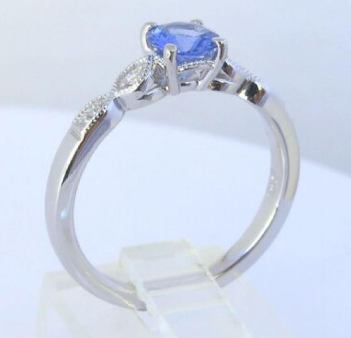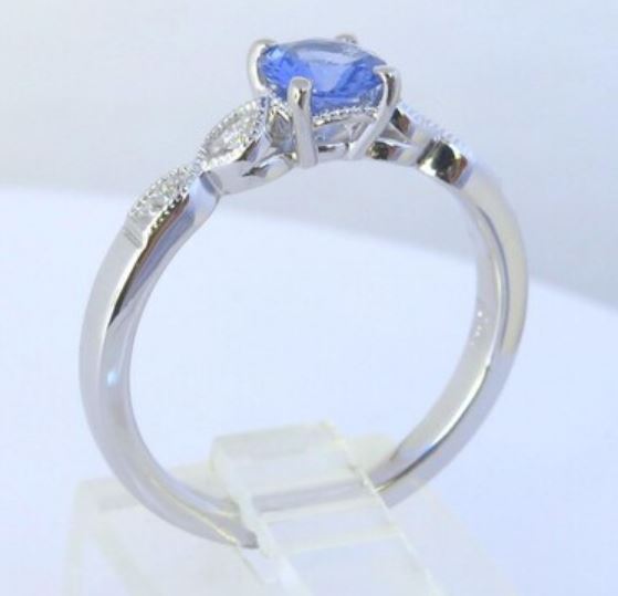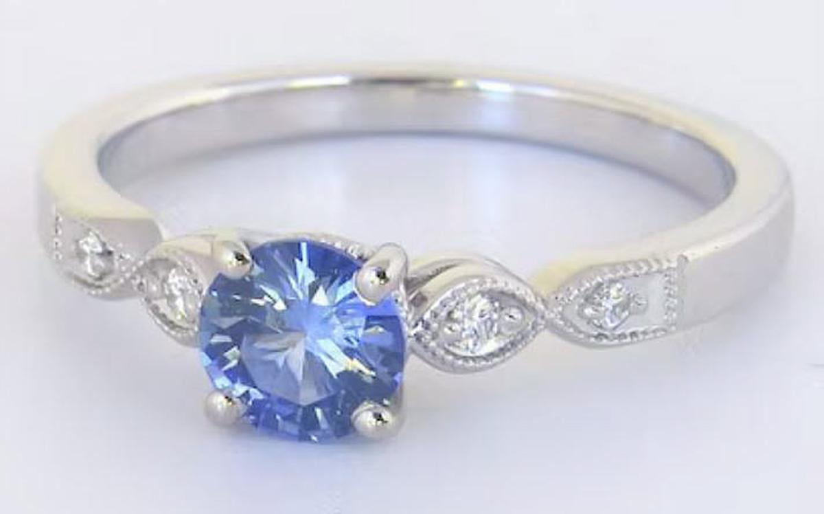 Delicate and timeless, this Ceylon blue sapphire and diamond ring is a graceful expression of elegance. At its heart is a 0.65 carat round sapphire (5.5mm), displaying a captivating light-medium cornflower blue hue - soft yet vibrant, reminiscent of a clear sky at dawn. The sapphire's natural brilliance is beautifully enhanced by 0.07cts of fine-quality diamonds, set in vintage-inspired marquise frames with delicate milgrain detailing. Crafted in 14K white gold, this ring is thoughtfully designed for both beauty and wearability. The subtle sparkle of the diamonds, paired with the sapphire's dreamy color, creates a piece that is understated yet enchanting. Imagine this elegant ring gracing your hand, a quiet reminder of something - or someone - you cherish. A piece to wear, love, and treasure for years to come. Considering as an engagement ring? A matching wedding band is available. Please contact us for more information.