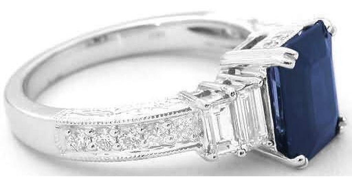 Gemstone: Natural Blue Sapphire Emerald Cut Sapphire Baguette Diamond Ring in 18k white gold