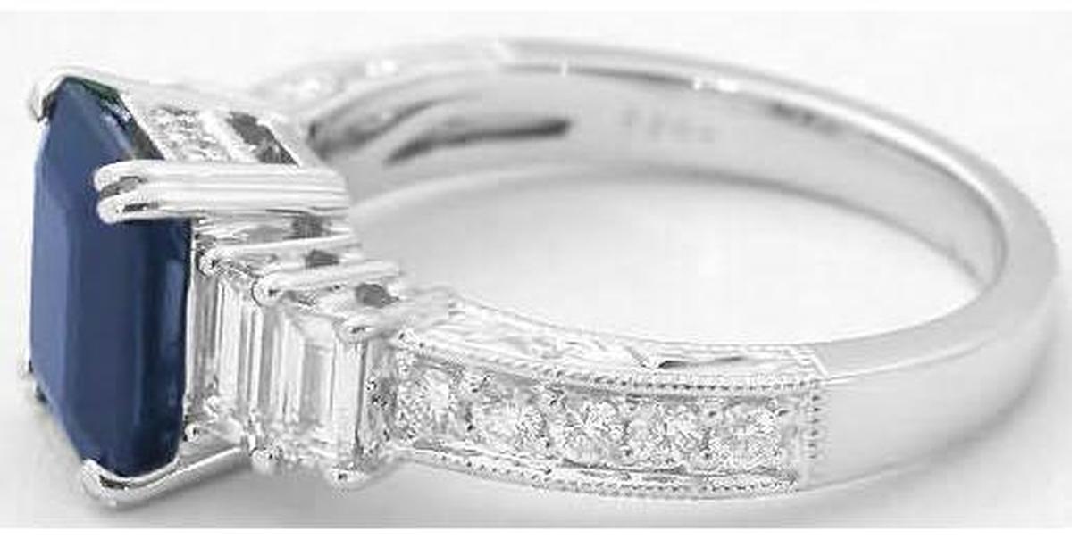 Special Features: Clean lines, elegant presentation and a rich, luxurious royal navy blue sapphire...what an incredible combination. The sapphire at the center is eye clean and is beautifully cut. The color is very striking and has a certain glow and brightness to it. We think that you will find yourself staring at this ring on your finger quite frequently! The setting features baguette diamonds on either side which complement the faceting of the sapphire.  We have set the sapphire in a luxurious 18k white gold setting, and the basket is adorned with tiny round diamonds and milgrain edging. The four sets of double prongs hold the stone securely! The white gold setting shows off just what fine quality the baguette and round diamonds are. The band is finished with milgrain edging and hand engraved detail on the sides.