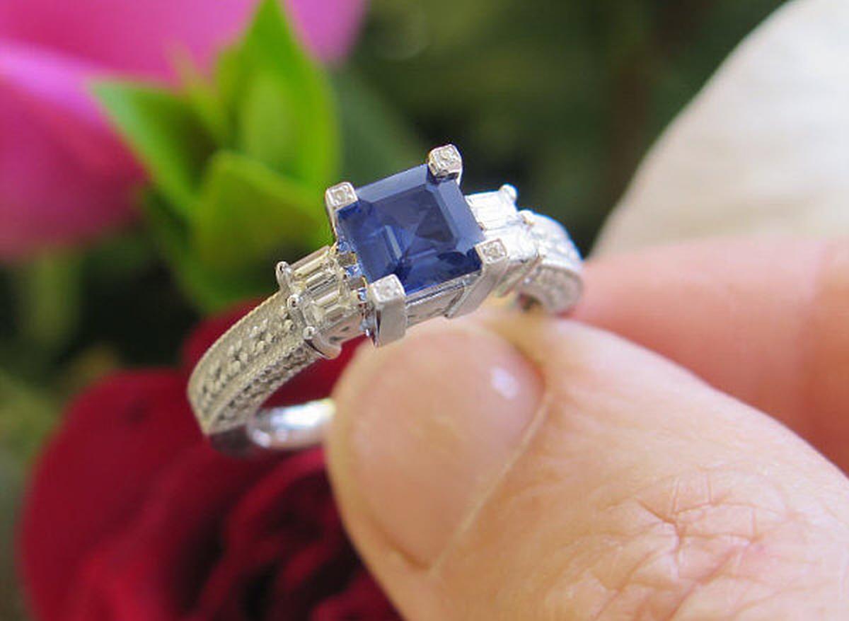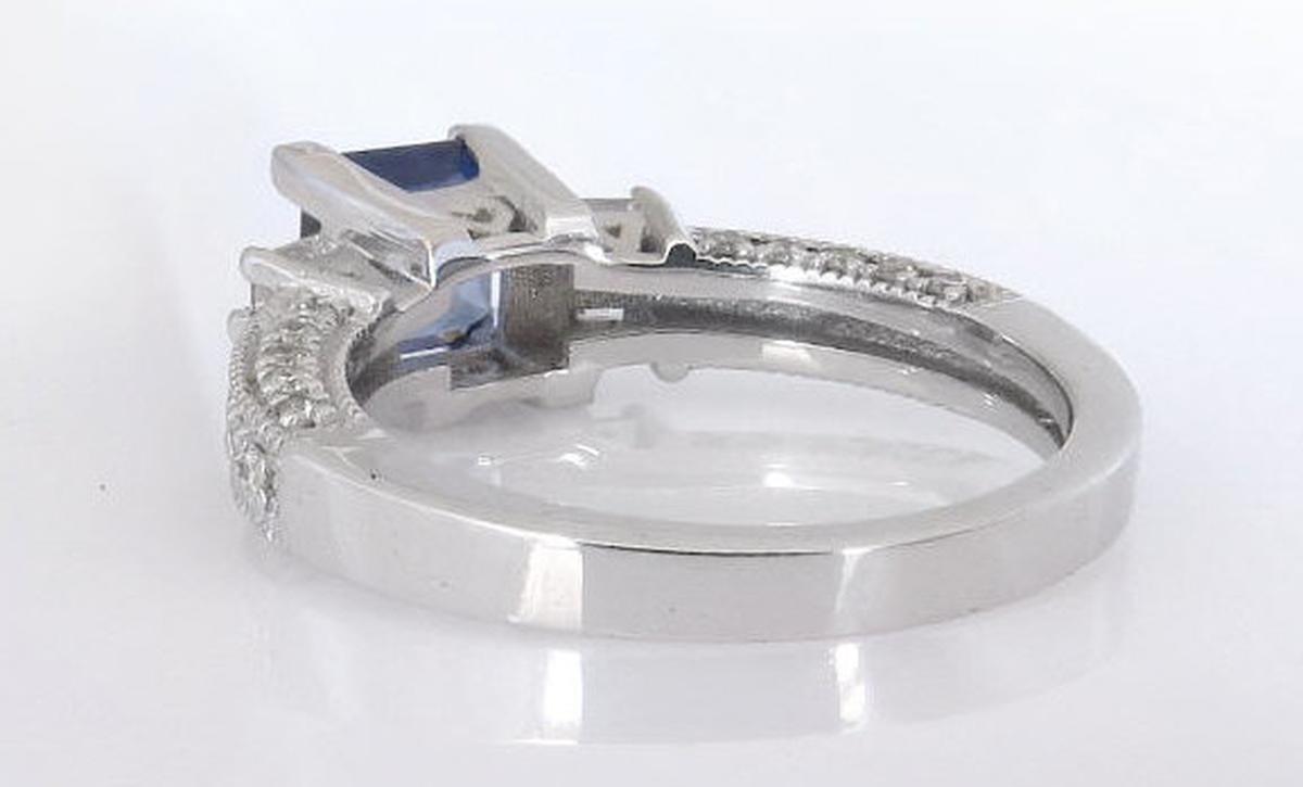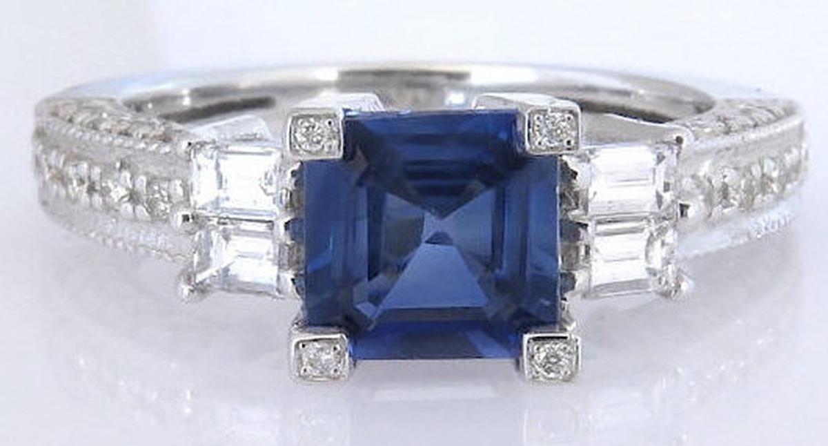 Special Features: Experience the epitome of elegance with this one-of-a-kind ring, featuring a stunning 1.0 carat square cut blue sapphire in a striking blend of royal blue, cornflower blue, and navy blue hues. The sapphire is securely held by four square prongs, each adorned with a full cut round diamond for added brilliance. The east-west set baguette diamonds on either side add a modern twist to the classic design, while the shank is finished with round diamonds on three sides for maximum sparkle. The gallery below the sapphire is accented by a heart so this ring certainly will appeal to the romantic in you. And with diamonds of exceptional quality, near colorless and better than eye clean, and a solid 14k white gold setting weighing 4.2 grams, this ring feels as luxurious as it looks. Make a statement with this exquisite ring that's sure to leave a lasting impression.