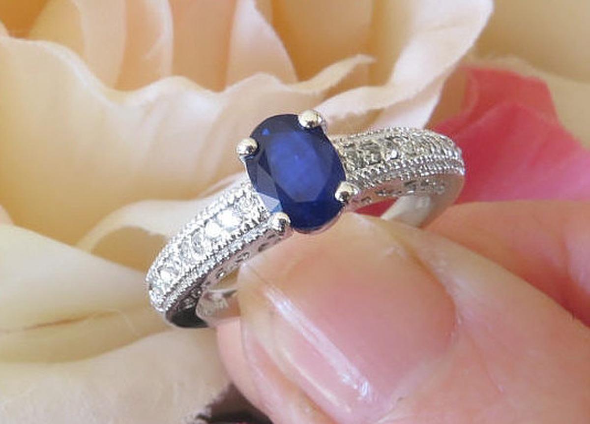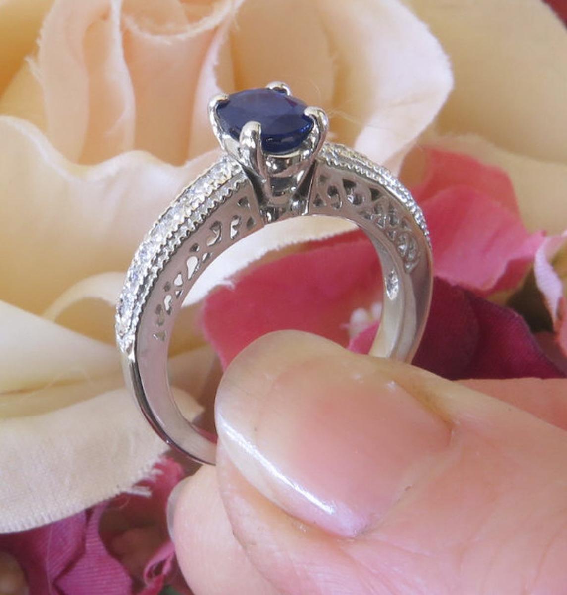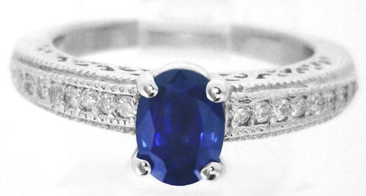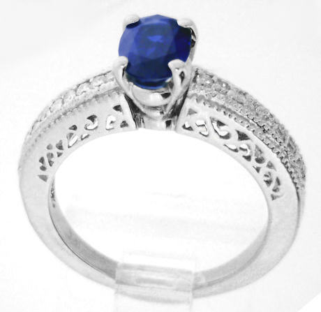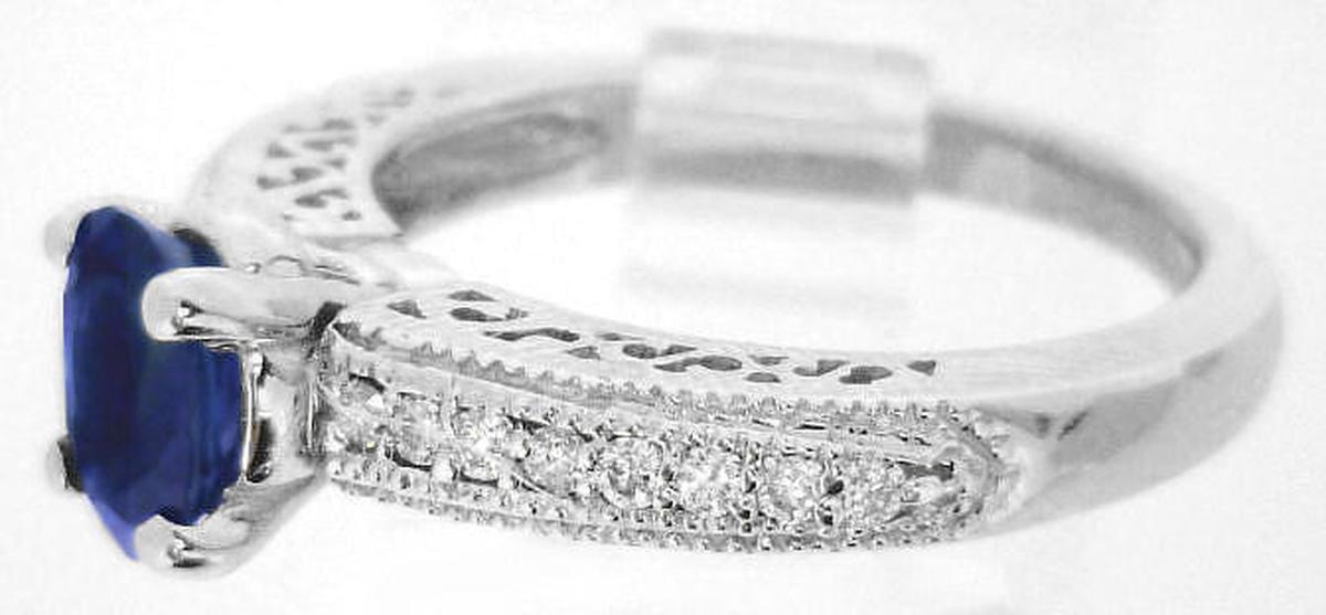 Special Features: What an elegant engagement ring this beautiful design would make. Full of intricate detail and featuring a gorgeous rich royal cornflower blue sapphire, this is absolutely stunning. The sapphire is roughly the size of a 1 carat oval diamond. Not too big and not too small, this size will work very nicely on all finger sizes. And for those of you looking for a setting with vintage styling, this ring has just that. Milgrain detail borders the bead set diamonds and the sides of the ring are finished a beautiful swirled pattern. The diamonds are eye clean and white and add the perfect touch of sparkle to the design. The gold weight in this setting is a very nice 5 grams. The ring is extremely comfortable and the thickness of the setting assures that it will stand up to a lifetime of wear.