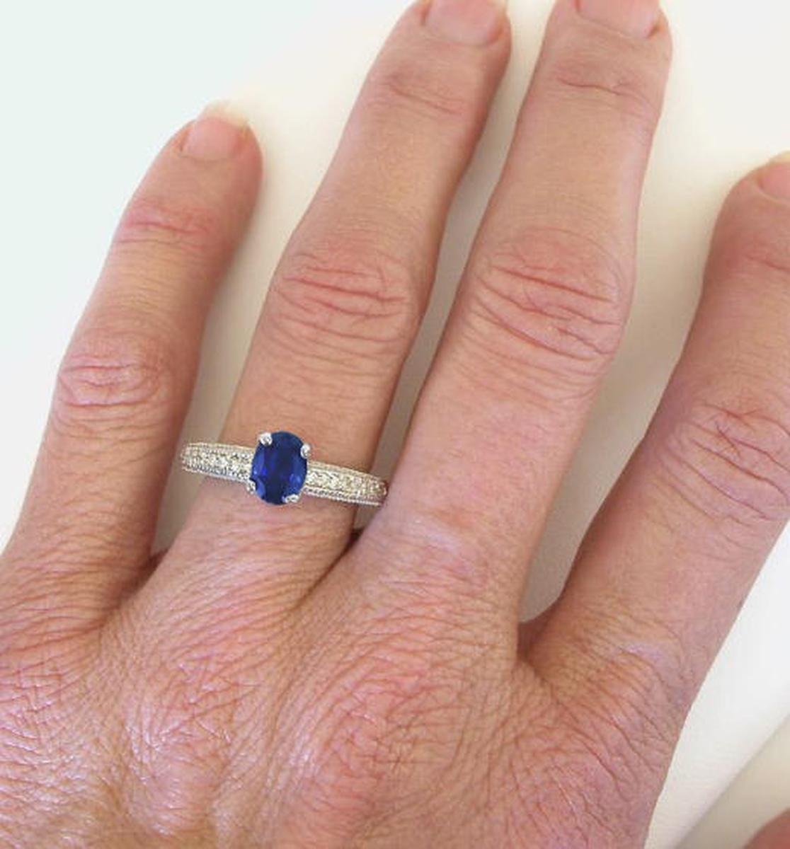 Natural Oval Blue Sapphire and Real Diamond Engagement Ring in solid Vintage style 14k white gold setting for sale   Natural Oval Cut Real Blue Sapphire Engagement Ring in solid 14k white gold