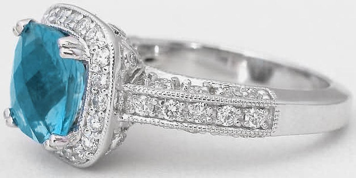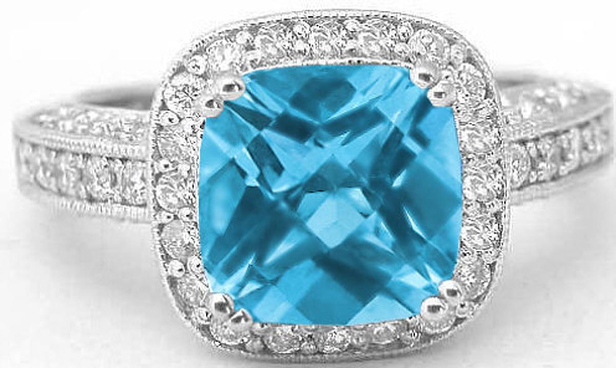 Special Features: A MJS Original Design: This has been a popular ring for us for awhile now and we have redesigned it with higher quality diamonds and with a modified gallery. The new gallery has a beautiful and elegant scroll pattern accented with diamonds and also tapers in gently. The blue topaz at the center is a 8mm cushion with checkerboard faceting on top. It has a gorgeous Swiss Blue color! It is lively, eye clean and looks amazing in the fancy mounting that is completely encrusted in fine diamonds.  Diamonds surround the blue topaz and more bead set diamonds adorn the top and sides of the shank.  The milgrain edging adds a vintage feel to the piece, and the ring is finished off with a beautiful undergallery.