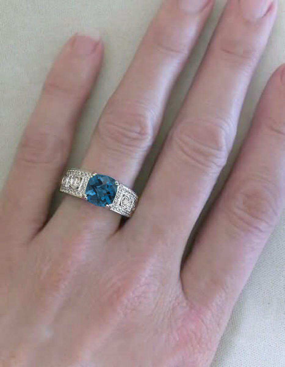 Special Features: We just love the wide band styling of this new ring. The flat profile makes this design one that you will be very comfortable wearing as often as you like. It begins with a spectacular cushion cut London Blue Topaz which is 8mm in size. It also has a checkerboard faceted top so it is quite a lively and beautiful gem. The ring itself is as wide as the topaz and is adorned with bead set and tube set diamonds. The addition of milgrain detail to the diamond channels and bezels lends an old world vintage feel to the ring. The ring has a nice gram weight so its quality and durability are evident as soon as you slip the ring on your finger. Note the beautiful undergallery which makes this ring extremely comfortable too.
