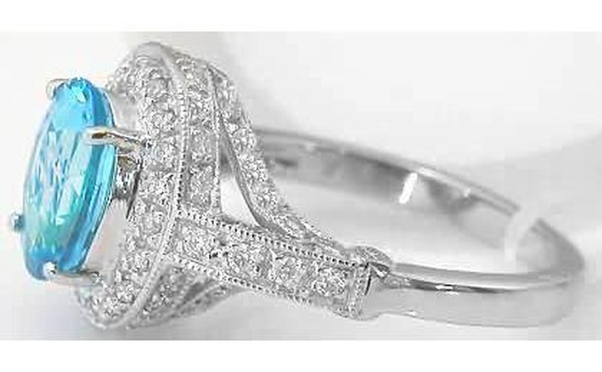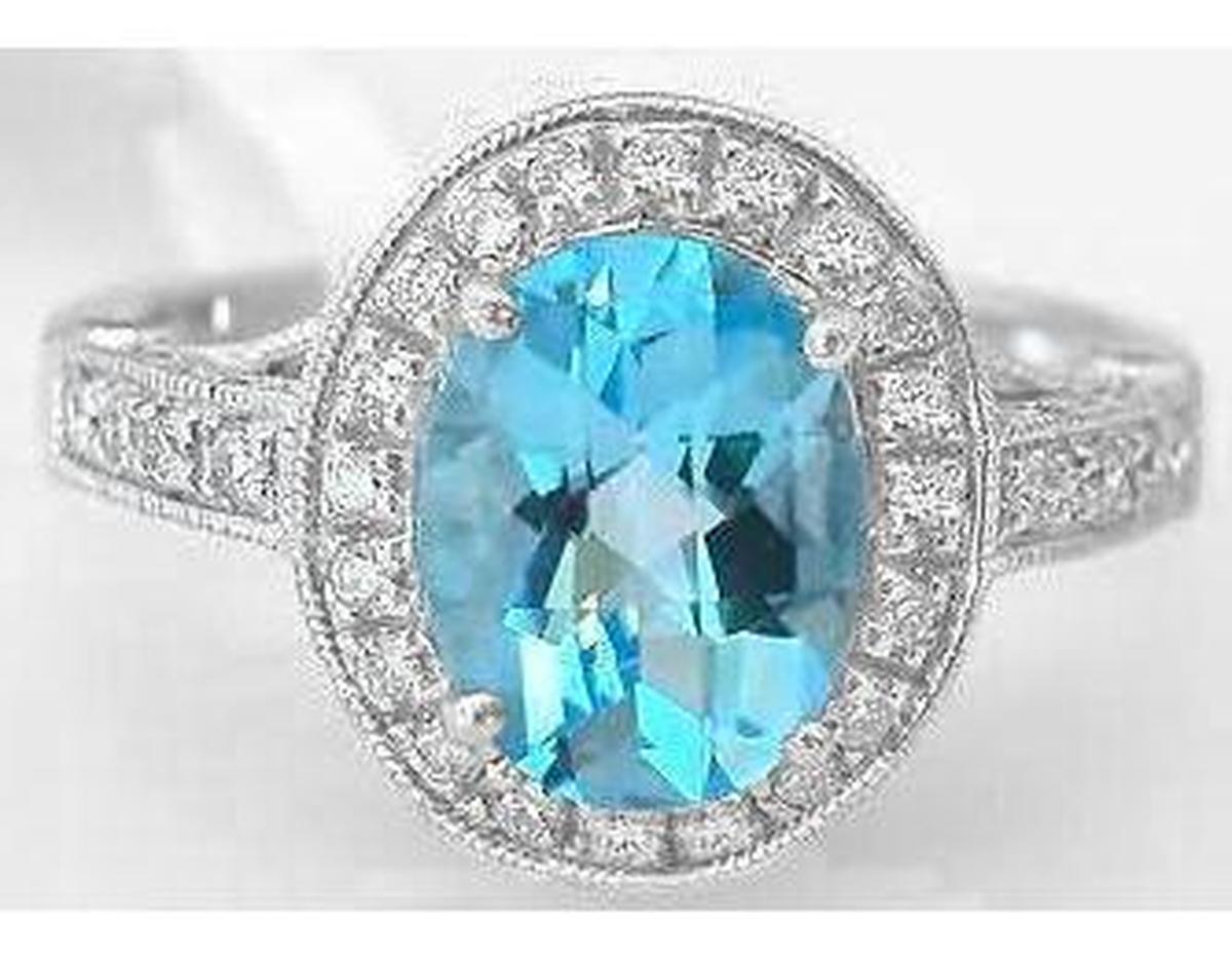 Special Features:Now here is a breathtaking design that is completed encrusted in diamonds! Gemstones are beautiful but fine diamonds take the design to the next level. At the center is an oval Swiss Blue Topaz with a gorgeous intense sky blue color. The bright color is wonderfully fresh and the fully faceted round diamonds that encircle the stone bring the color to life. The gallery is accented by more diamonds and even three sides of the band are covered with sparkling diamonds as well. The delicate milgrain detail that borders the diamond channels lends a vintage feel to the design. This ring is ideal for the lady who, when given the choice between a beautiful gemstone or diamonds, says 'I'll take both, thank you"!
