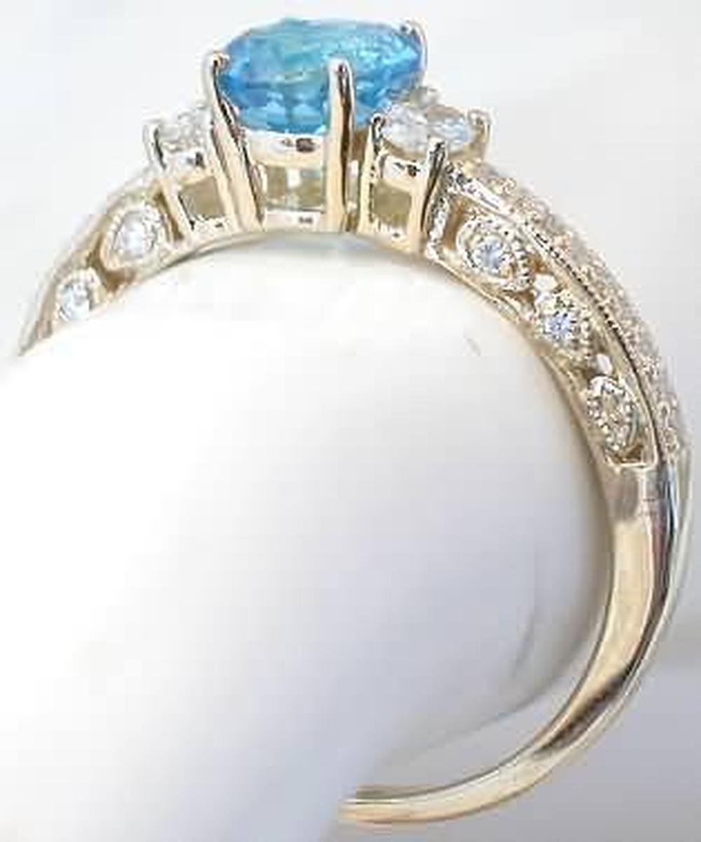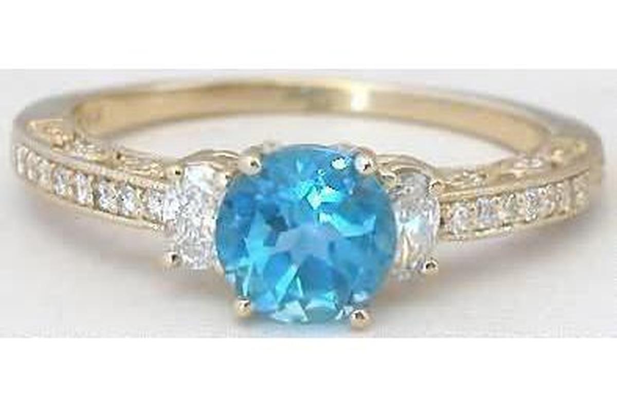 Special Features: You have your choice of a round or oval or center Swiss blue topaz! The setting is delicately styled and looks like an heirloom piece that has been part of your family for generations.  Large oval diamonds are set on either side of the blue topaz and and tiny bead set round diamonds adorn the band. Milgrain edging and sweet teardrop accents on the sides of the band completes the look.