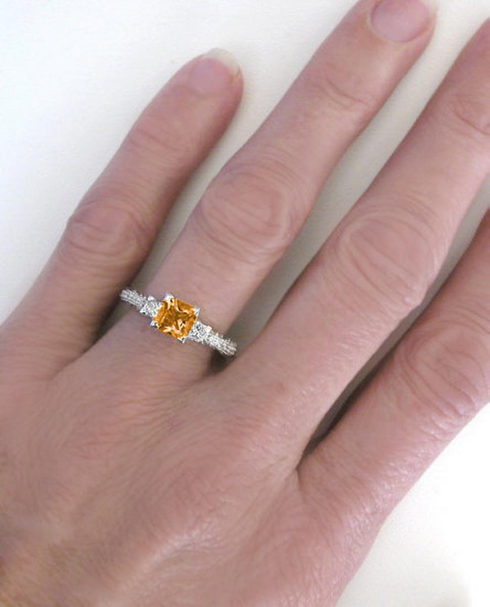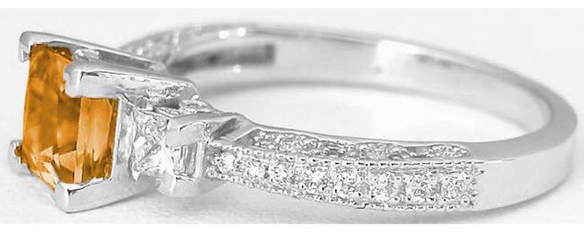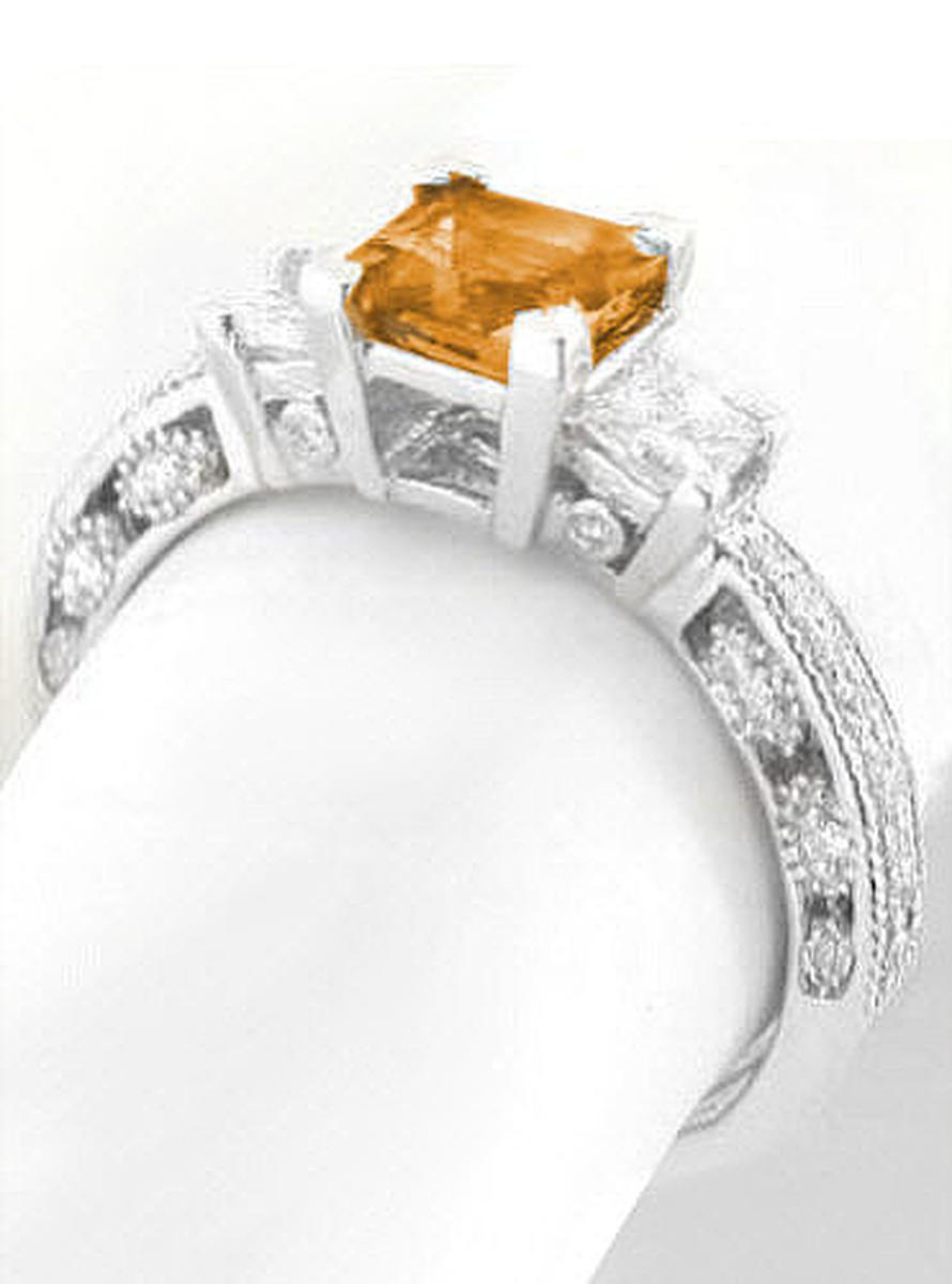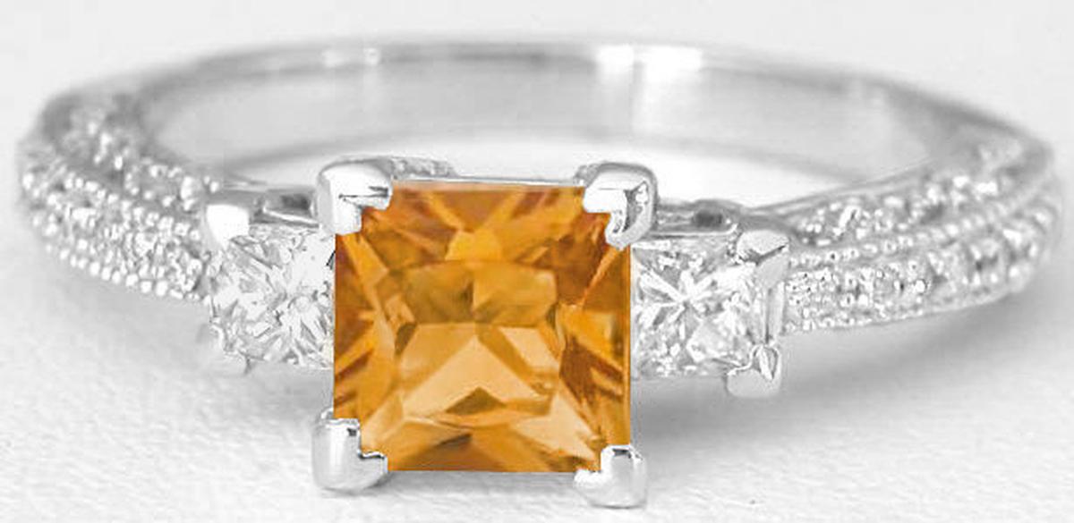 Special Features: This antique inspired design is tasteful and elegant and features November's birthstone, citrine. The princess cut citrine is 5.5mm in size, the same size as a 1 carat princess cut diamond. The brilliant faceting is really beautiful and the citrine's golden orange hue just glows. On either side of the citrine is a fine quality princess cut diamond. The diamonds are near colorless and better than eye clean and are approximately 0.15 carats each in side.  The vintage appeal this ring offers comes from the delicate milgrain edging and tiny bead set diamonds in the shank. Notice too the elegant marquise detail on the sides of the band. From every angle, this ring is worthy of admiration.