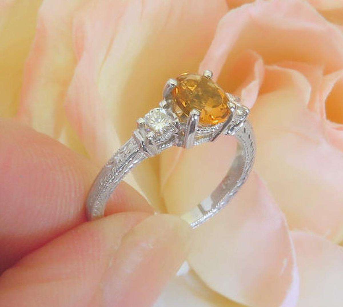 Past Present Future Citrine Ring in 14k white gold with Engraving for sal    Three Stone Citrine and Diamond Engagement Ring in 14k white gold with Engraving for sale