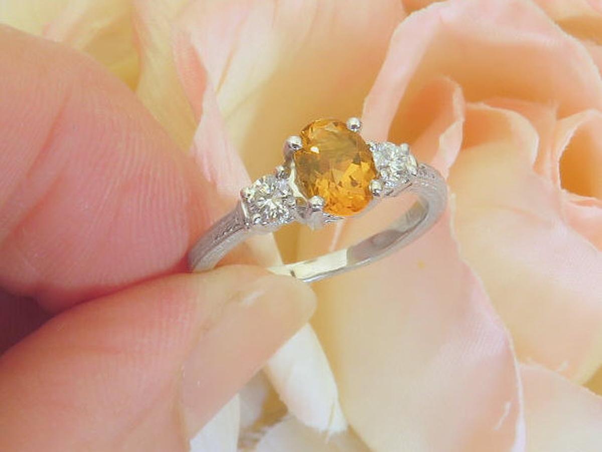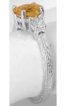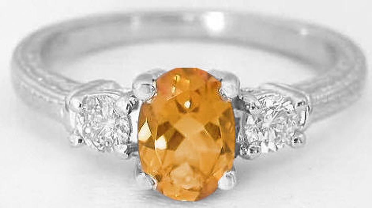 Special Features: A MJS Original Design:  Past-present-future, or three-stone, rings are classics that will always be a wonderful and elegant. But with this original MJS design, we've turned a classic up a notch by engraving the citrine ring on all three sides with beautiful Woodstock's feet and flowers. The citrine at the center measures 7x5mm and is equivalent in size to a 1 carat diamond. Beautiful fine quality, eye clean, round diamonds accent each side and add a tasteful touch of sparkle to the design.
