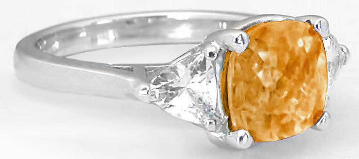 Special Features: A MJS Original Design: We love the styling of a past-present-future, or three-stone, ring. Classic and traditional, they are always an excellent choice. What sets this one apart from the diamond versions you have seen is the gorgeous 8mm cushion cut checkerboard faceted citrine we have set in the center. It has a lovely yellowish orange color, not too pale and just right. The citrine is very well cut and eye clean. We have set a trillion white sapphire on each side which tastefully balances the design beautifully. The white sapphires also have a very similar look to diamonds for a fraction of the cost.