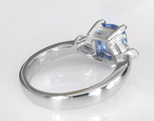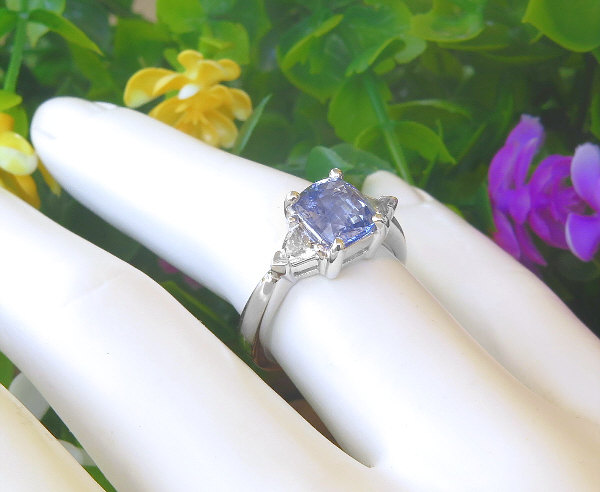 Special Features: For those looking for an amazing gemstone ring without diamonds, we have created this elegant and traditional ring a combination of fine quality blue and white sapphires. The center gemstone is a 2.09 carat cushion cut sapphire (not lab created) from Sri Lanka (Ceylon). Sapphires from Sri Lanka generally are more lively and brilliant than sapphires from other origins and this particular gem is no exception. The sapphire also has a very nice cut and is eye clean. The color is a light-medium periwinkle cornflower blue. The trillion cut white sapphires are 4mm in size and are eye clean as well. The 14k white gold setting weighs 5 grams so the ring has a nice thickness (yet is still comfortable!) that will stand up to a lifetime of wear.
