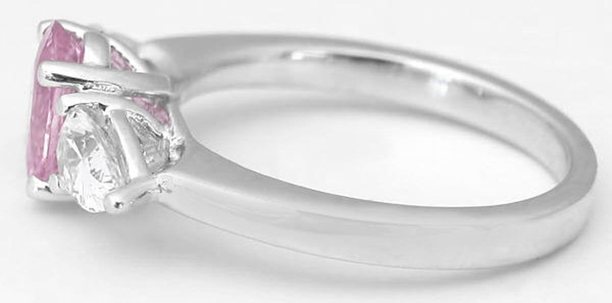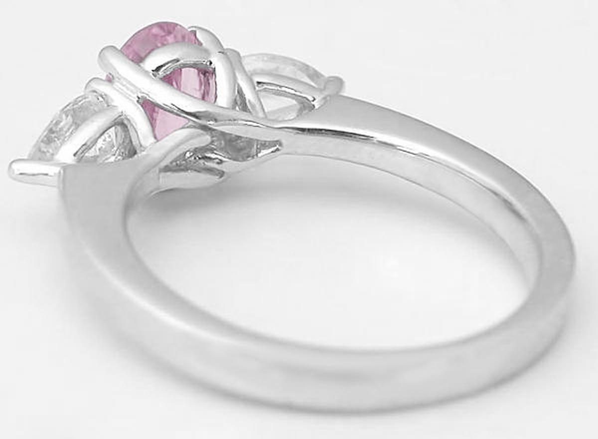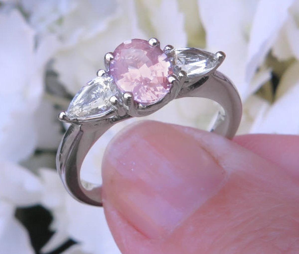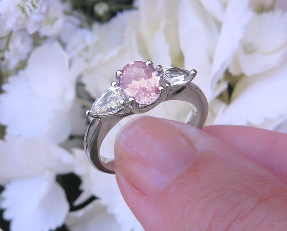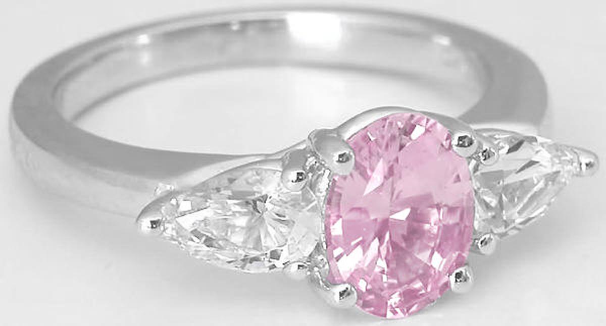 Special Features: Simple elegance. The beautiful oval light pink sapphire at the center is flanked by two pear shaped white sapphires for a clean timeless look. The white sapphires are a great diamond alternative and definitely make the ring much more affordable! The 14k white gold setting is done in a lucida (trellis) style with prongs that crossover each other. It's a unique look and can be seen in one of our photos. The setting has a durable gram weight of 4 grams so this is definitely a ring that will easily stand up to daily wear. The pink sapphire has a very nice cut and does not have a window (where you see right through the stone to your finger). All of the sapphires are eye clean and nearly loupe clean too.