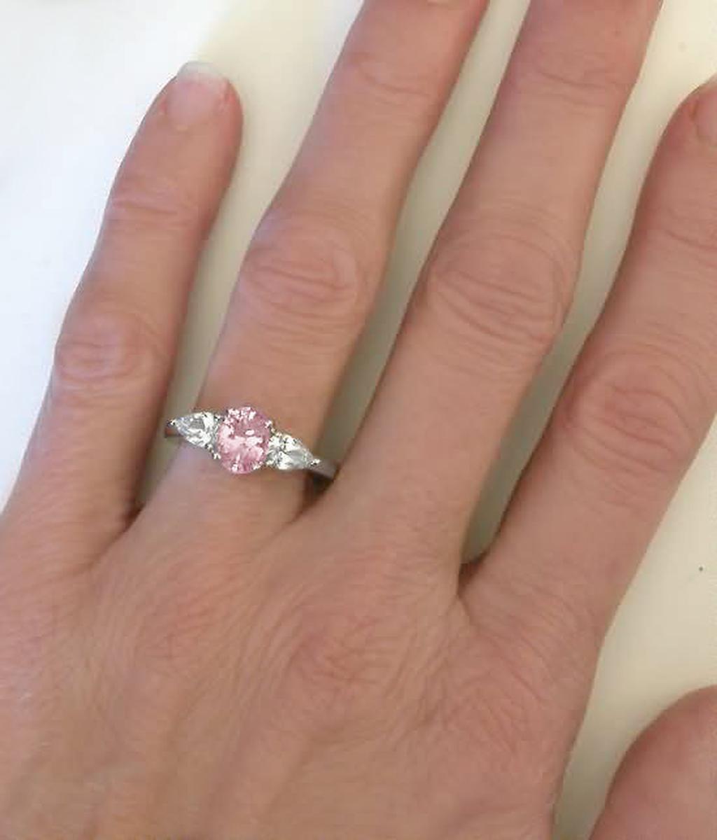 3 Stone Pink and White Sapphire Rings    Princess-cut Pink Sapphire Ring  Diamond Alternative Engagement Rings  Oval Pink Sapphire and White Sapphire Ring
