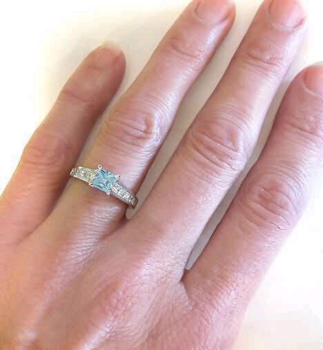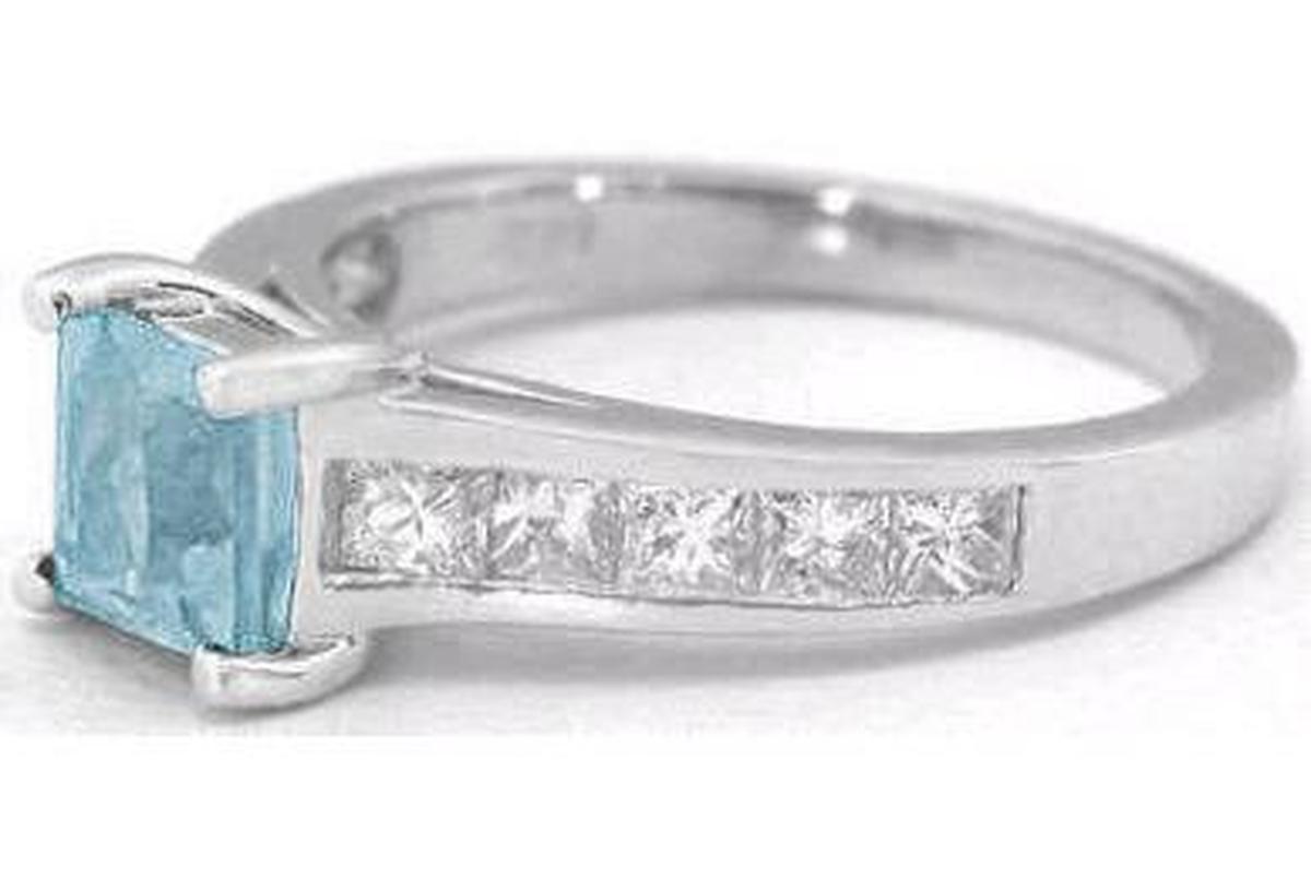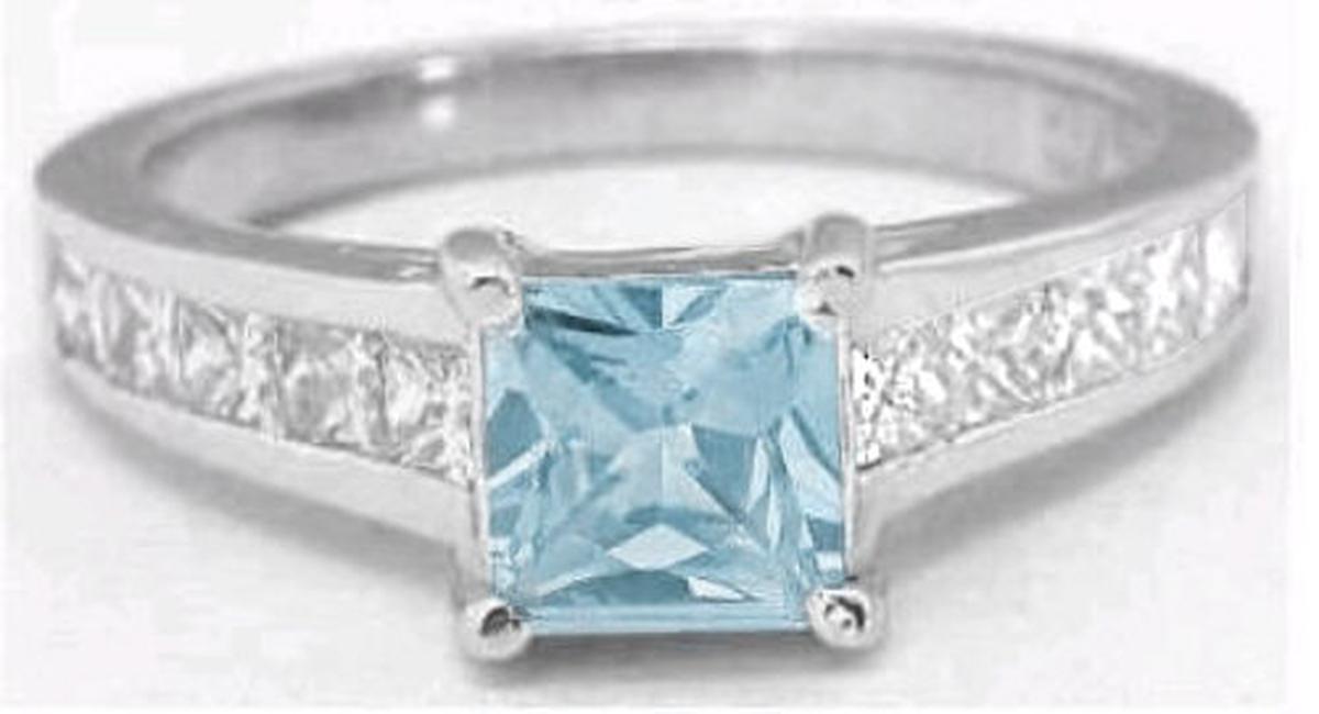 Special Features: This sleek and tailored design features a beautiful princess cut aquamarine in a classic channel set band full of princess cut white sapphires. The aquamarine has a rich sky blue color, is eye clean and weighs 0.64 carats. It is 5.5mm in size and is the size of a 1 carat princess cut diamond. There are a total of 10 white sapphires in the band totaling 0.60 carats. The white sapphires have a similar look to diamonds at a much lower price. This ring is perfect for the lady who prefers a more simple and understated design. And for those not wanting diamonds, this is a great option as well.