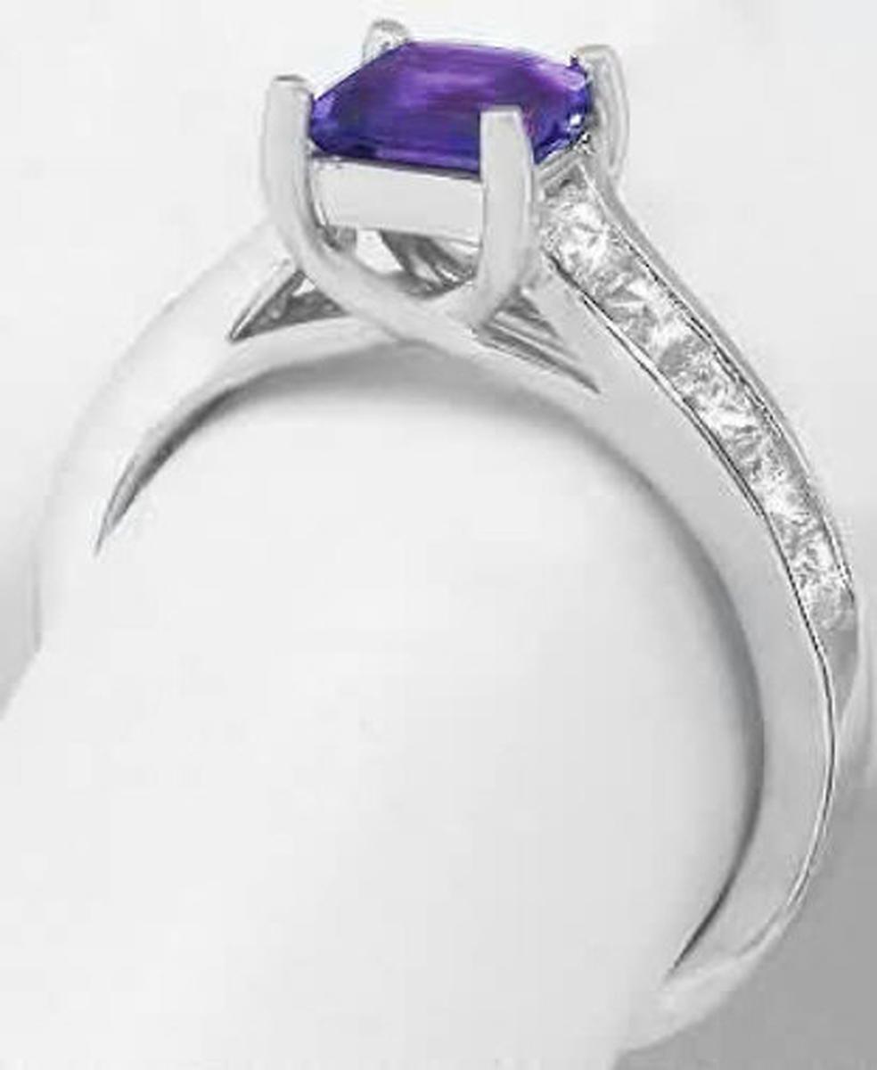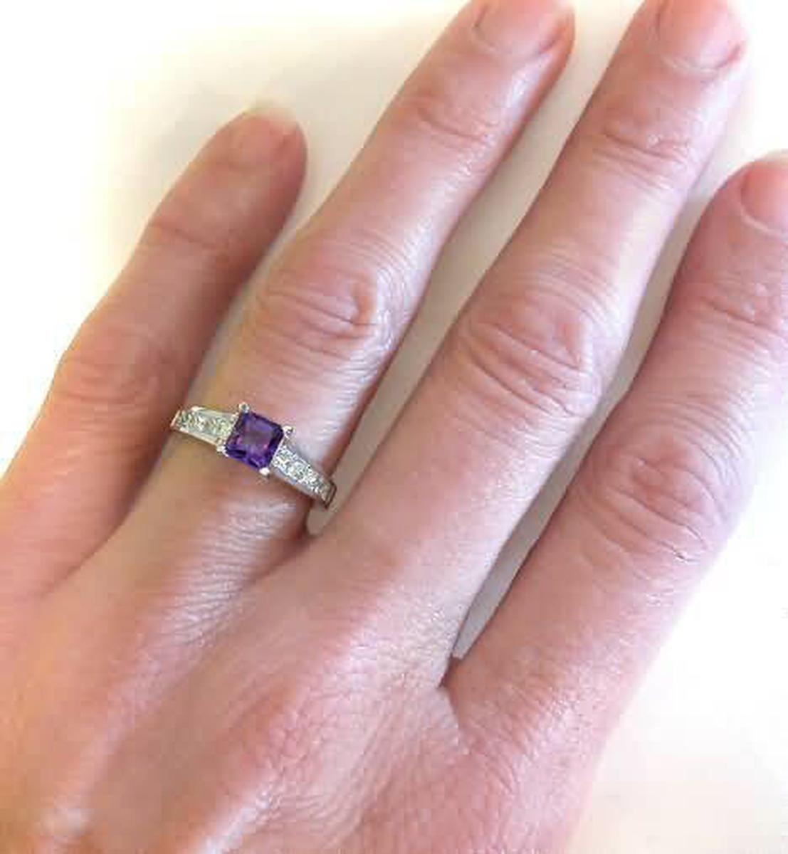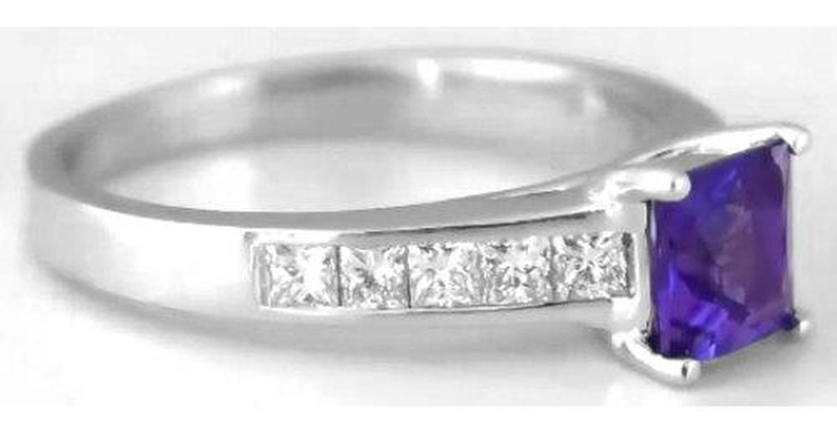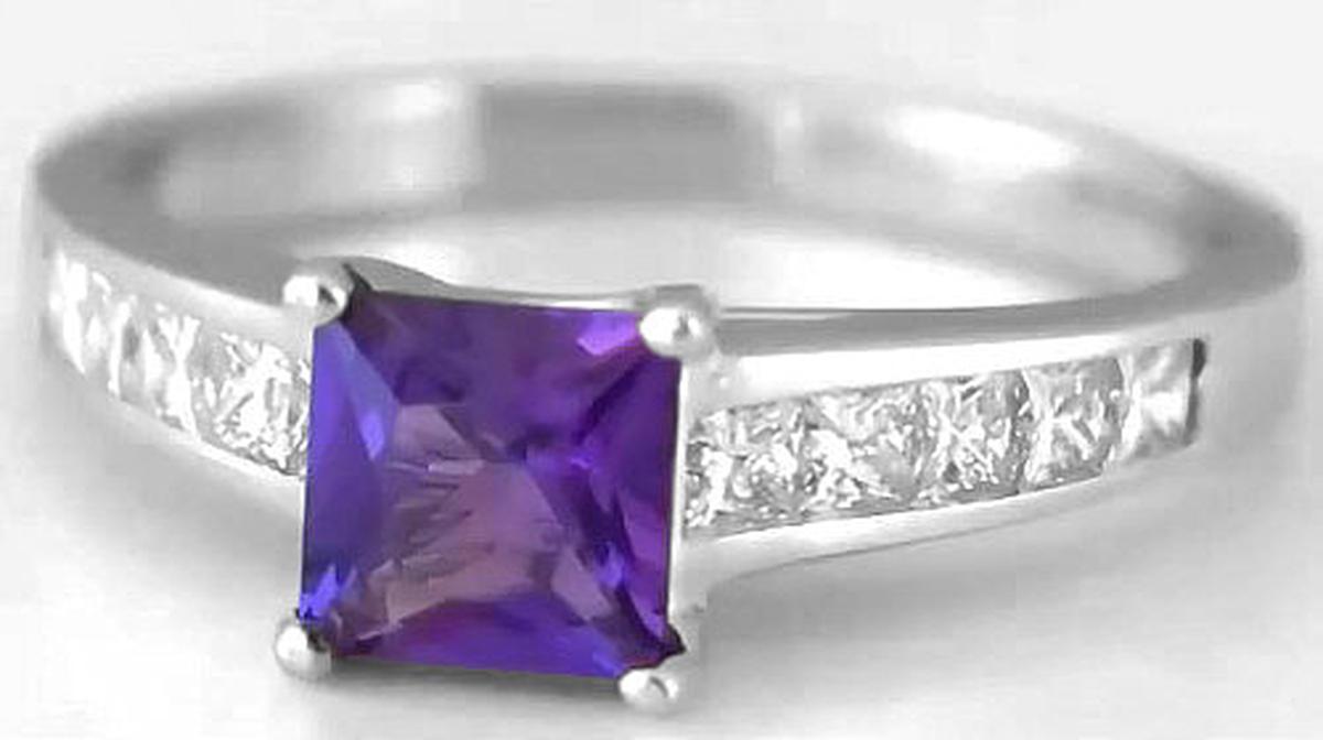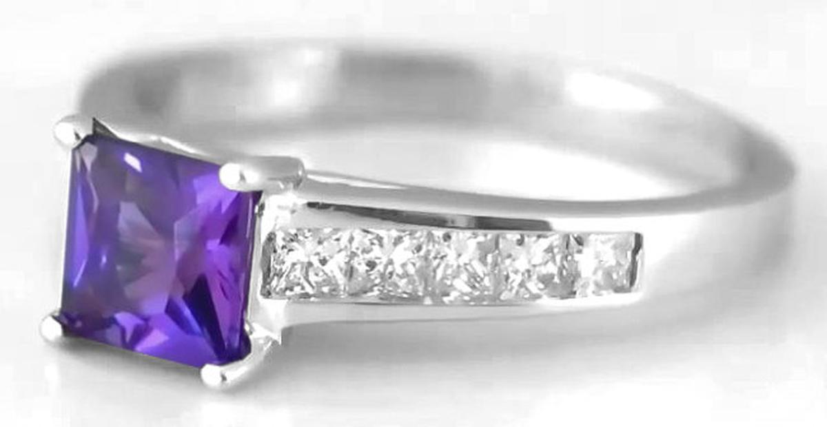 Special Features: This sleek and tailored design features a beautiful princess cut amethyst in a classic channel set band full of princess cut white sapphires. The amethyst is eye clean and weighs 0.85 carats. It is 5.5mm in size and is the size of a 1 carat princess cut diamond. There are a total of 10 white sapphires in the band totaling 0.60 carats. The white sapphires have a similar look to diamonds at a much lower price. This ring is perfect for the lady who prefers a more simple and understated design. And for those not wanting diamonds, this is a great option as well.