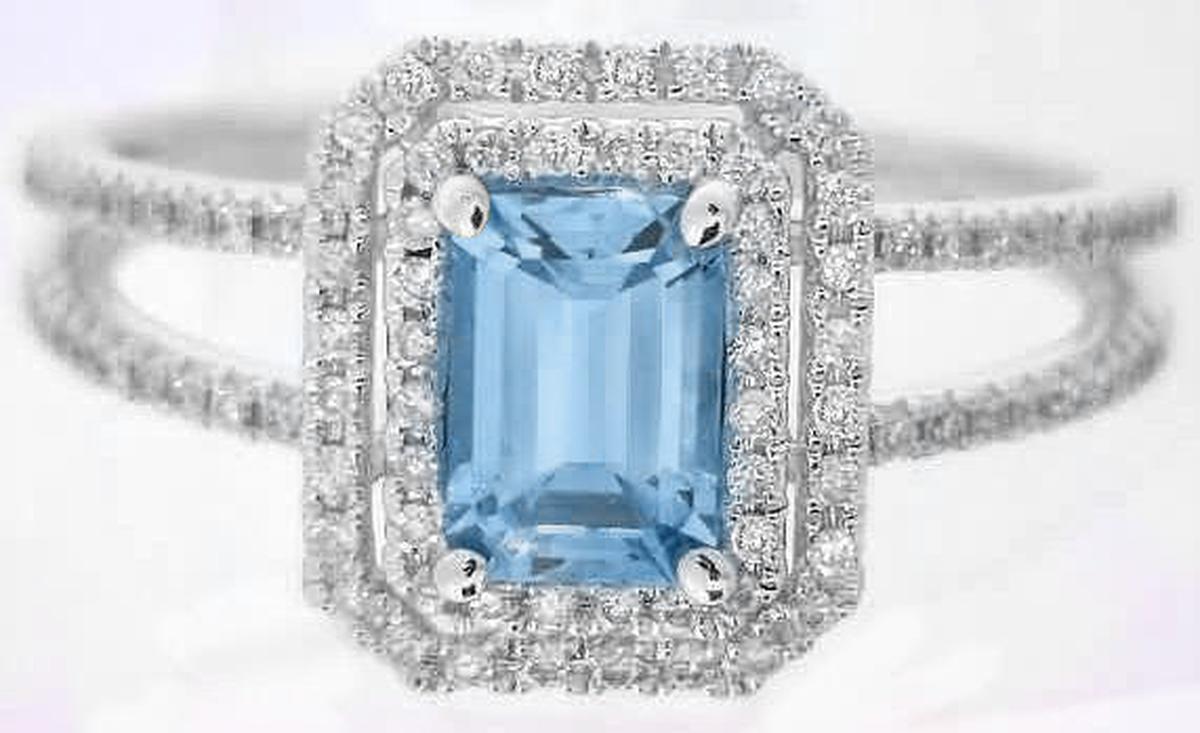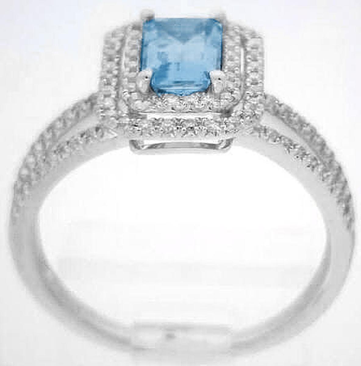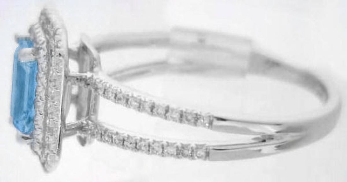 Special Features:This outstanding engagement ring features an amazing emerald cut Santa Maria aquamarine with a double halo of gorgeous diamonds in a delicate split shank setting. The quality of the aquamarine is exceptional and the Santa Maria, Brazil origin speaks to the fine color of the gem as well. Some of the most prized aquamarines are from Santa Maria. The hue is a perfectly saturated sky blue. The color is intense without it looking like a blue topaz!  The straight lines of the emerald cut gem are clean and crisp and contrast beautifully with the surrounding diamond halo setting. The split shank is also adorned with diamonds that extend half way around the ring. The low profile of the setting is perfect for a ring that will be worn daily.